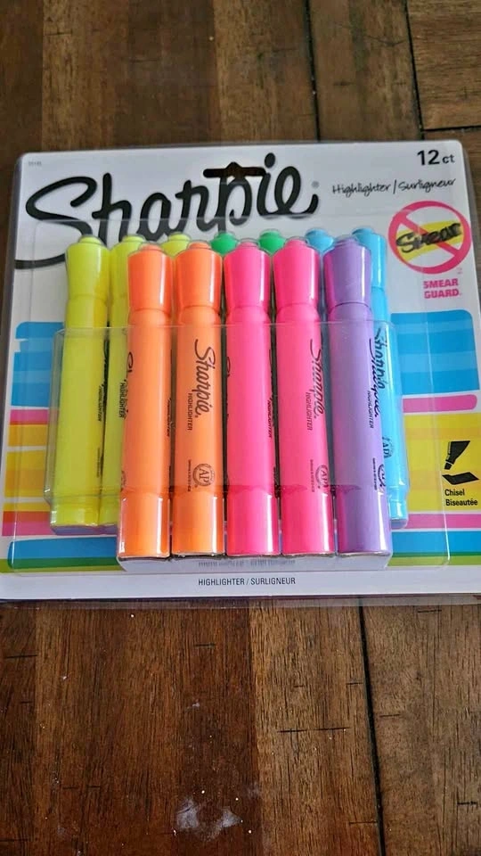 Colorful Sharpie highlighters, 12 count pack. Has smear guard technology and chisel tips. All new, never opened. Great for school or office stuff.