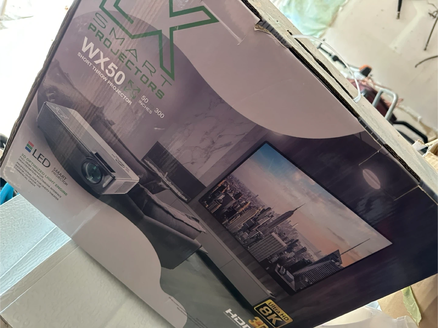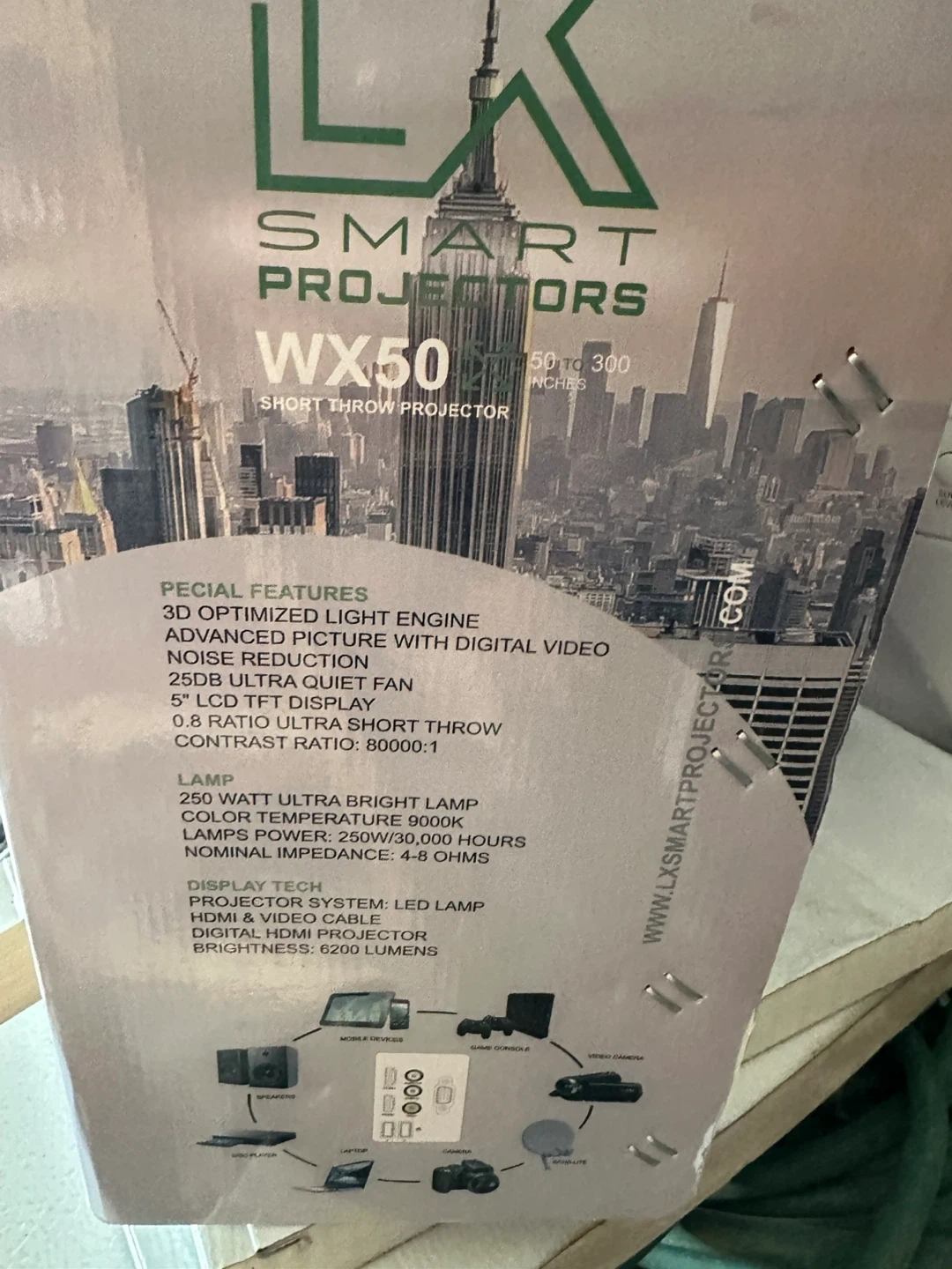 This is an LX SMART Projectors WX50 short throw projector. It has a 5" LCD TFT display, 250W ultra-bright lamp, and 6200 lumens brightness. Noise reduction is included.