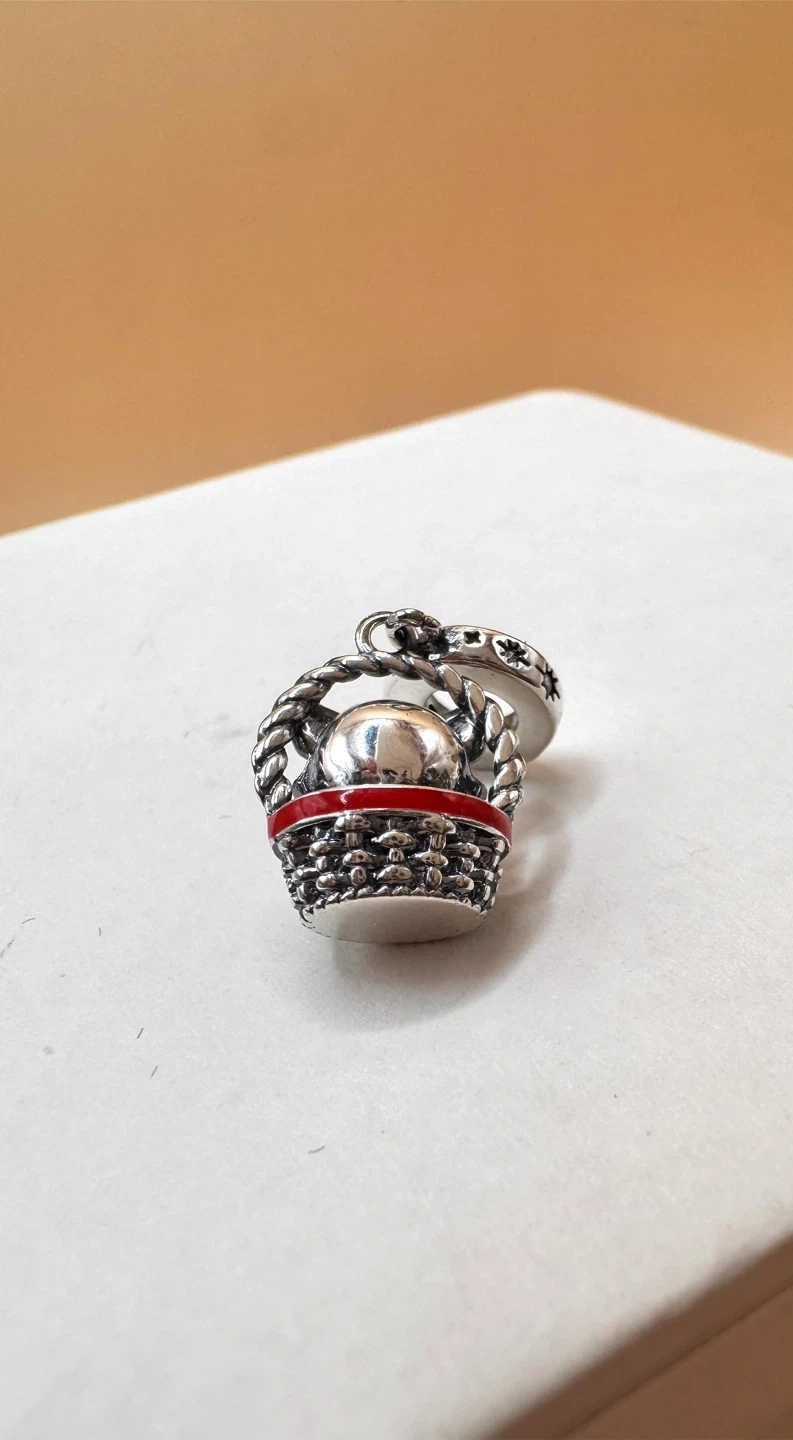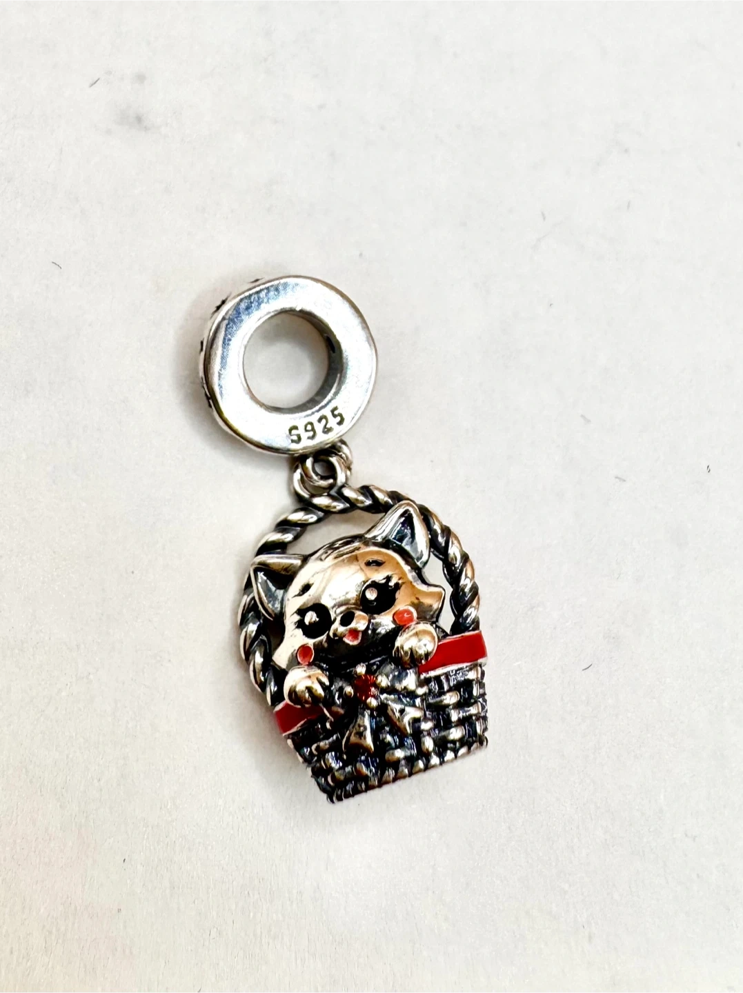 This is a charming sterling silver pendant featuring a cute cat peeking out of a basket. It's detailed with a red accent band on the basket. It's a sweet addition for any charm bracelet or necklace collection!