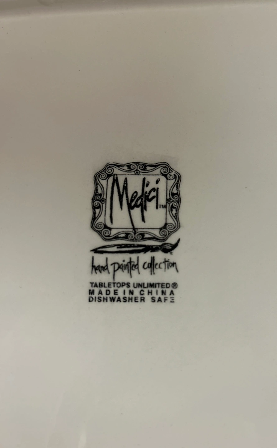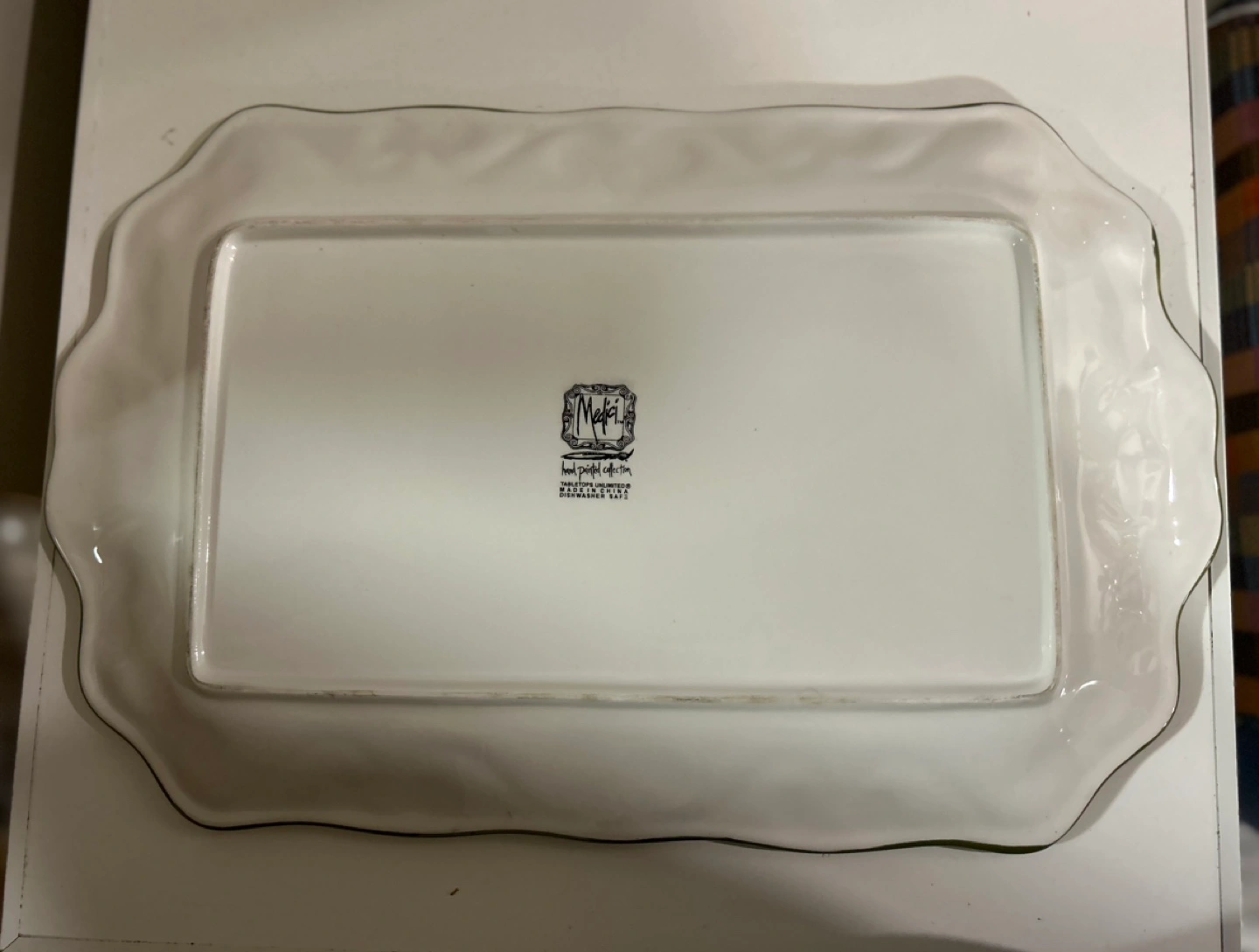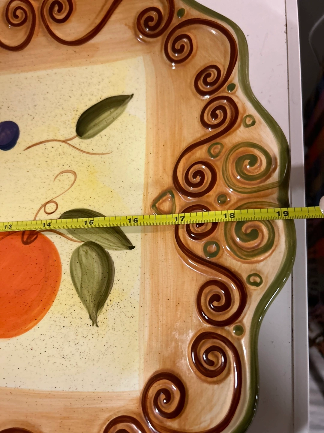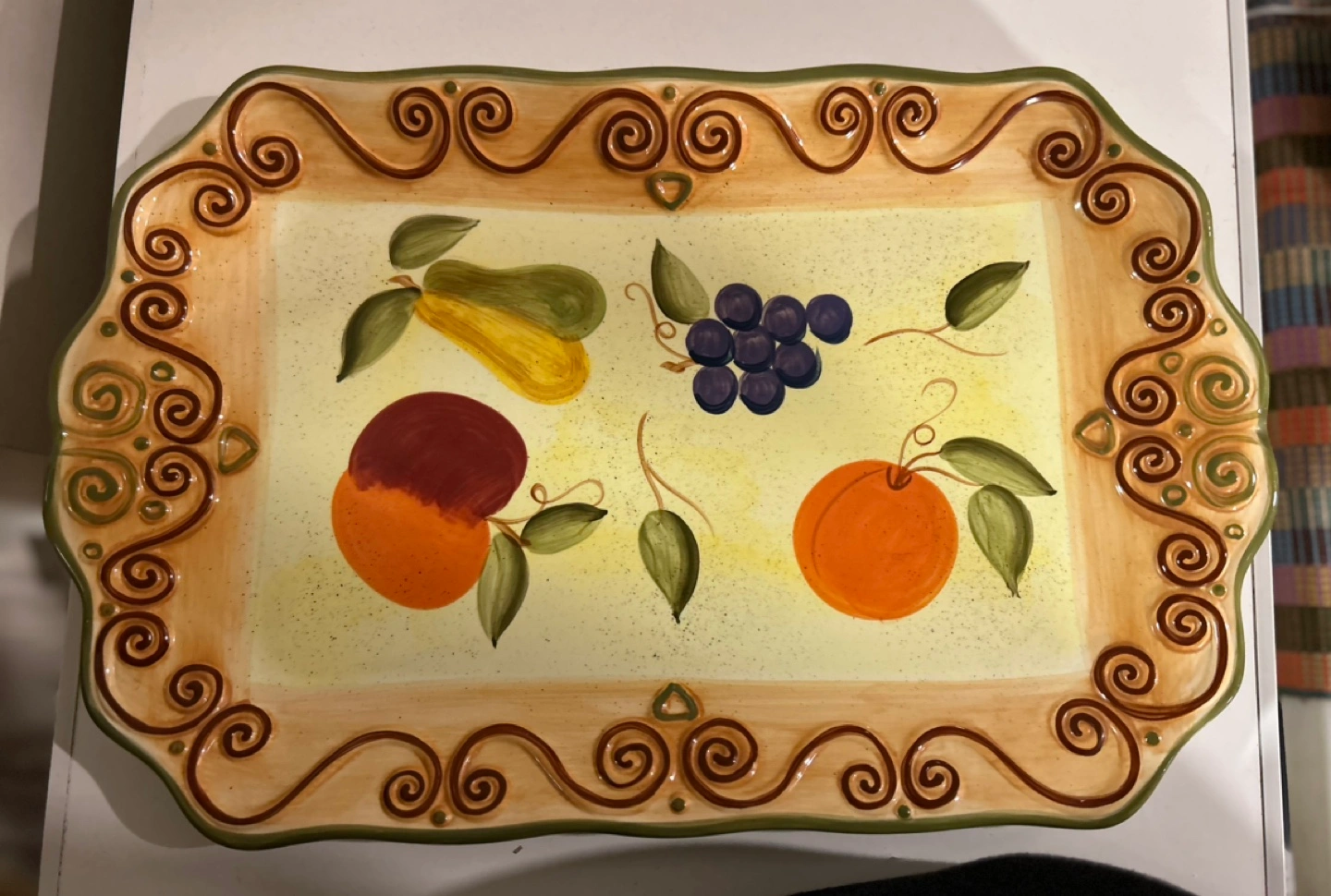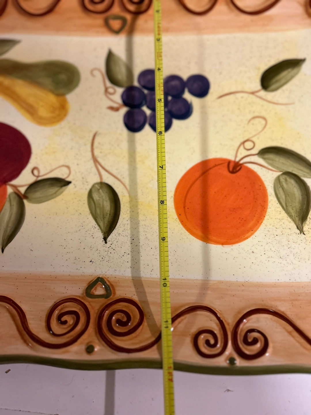 Large rectangular serving tray. Hand-painted fruit design. Ornate border. Measures approximately 17" x 11". Dishwasher safe. Used a couple of times. Like new