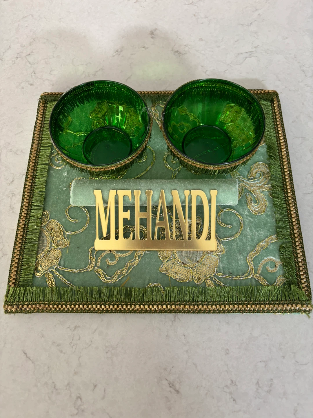 Selling a decorative Mehndi plate featuring two green bowls. The plate has intricate gold embroidery and fringe detailing. It's perfect for adding a touch of elegance to your Mehndi celebrations or as a unique decorative piece