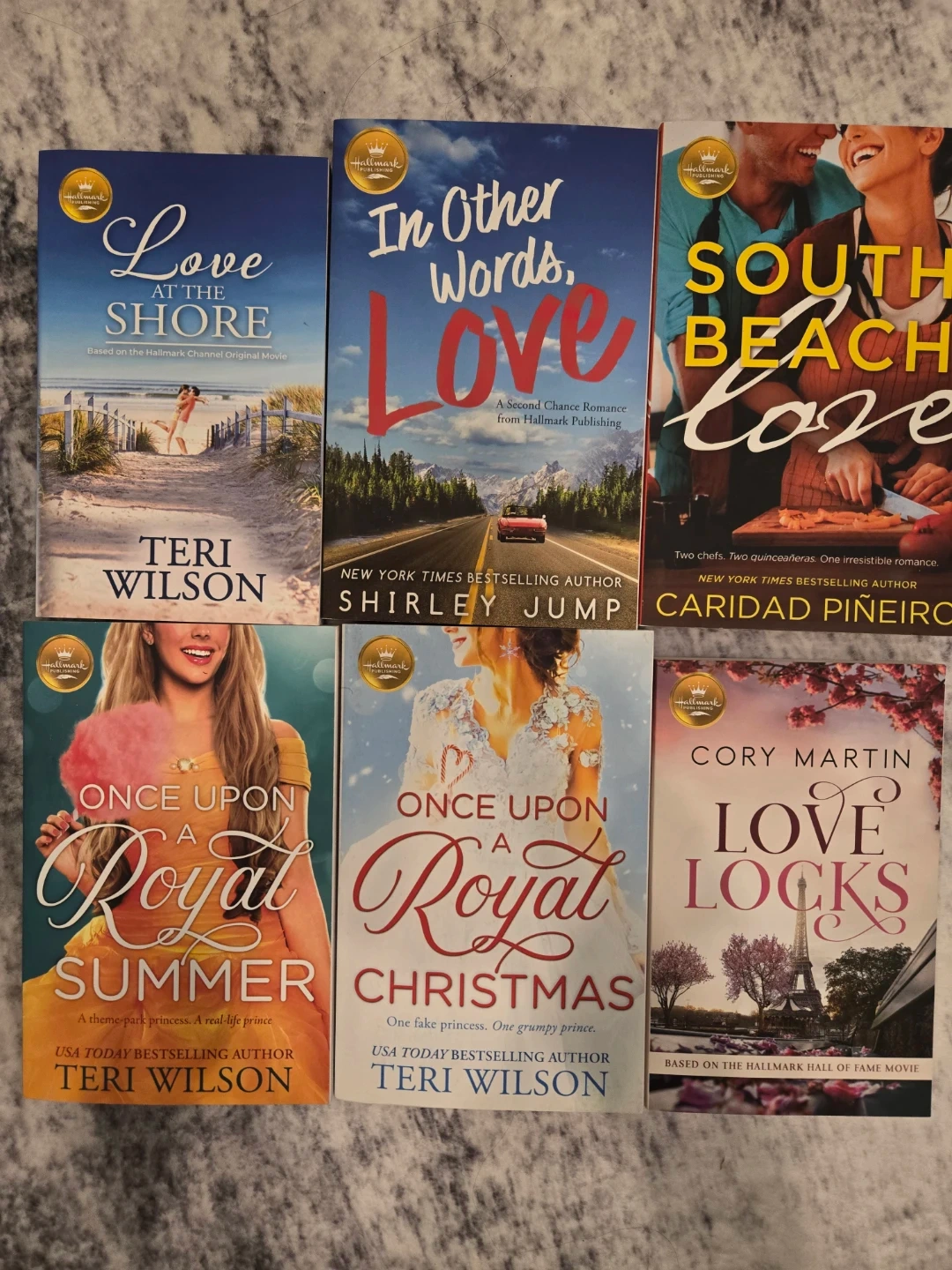 A collection of six Hallmark Publishing romance novels. Titles include 'Love at the Shore', 'In Other Words, Love', 'South Beach Love', 'Once Upon a Royal Summer', 'Once Upon a Royal Christmas', and 'Love Locks'. These books are perfect for fans of lighthearted romance stories.