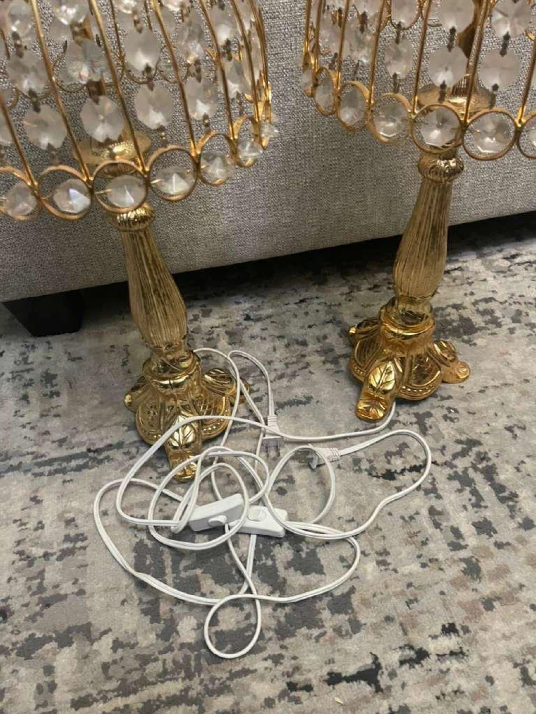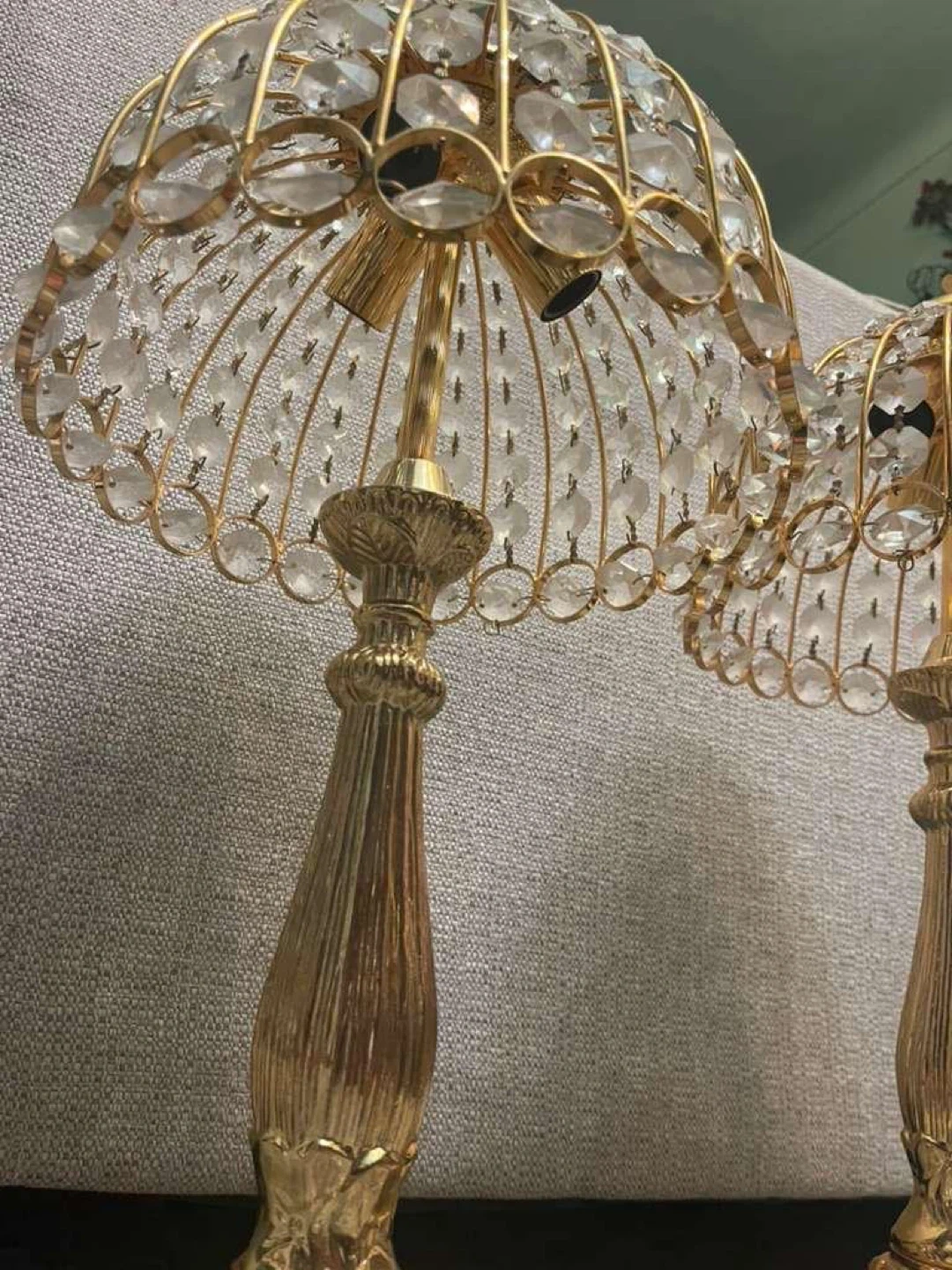 Features: The shade is a prominent "basket" or "umbrella" style, designed to refract light through the crystal strands for a glamorous effect. The bases are often ornate with a floral or scrolled pedestal design.