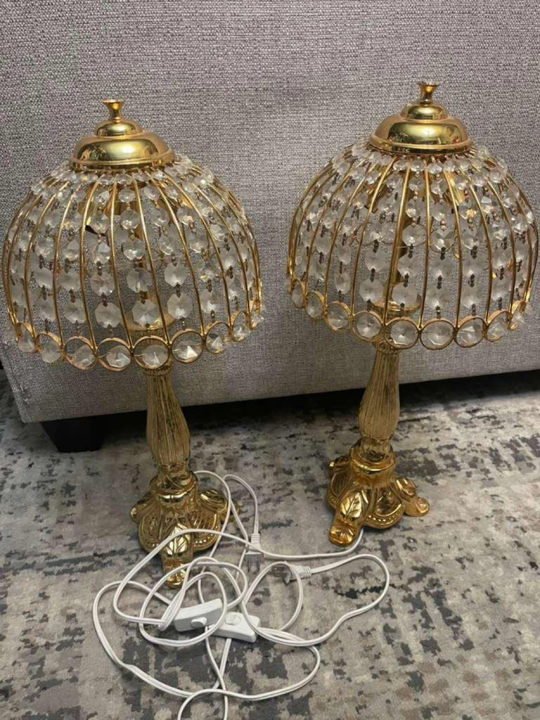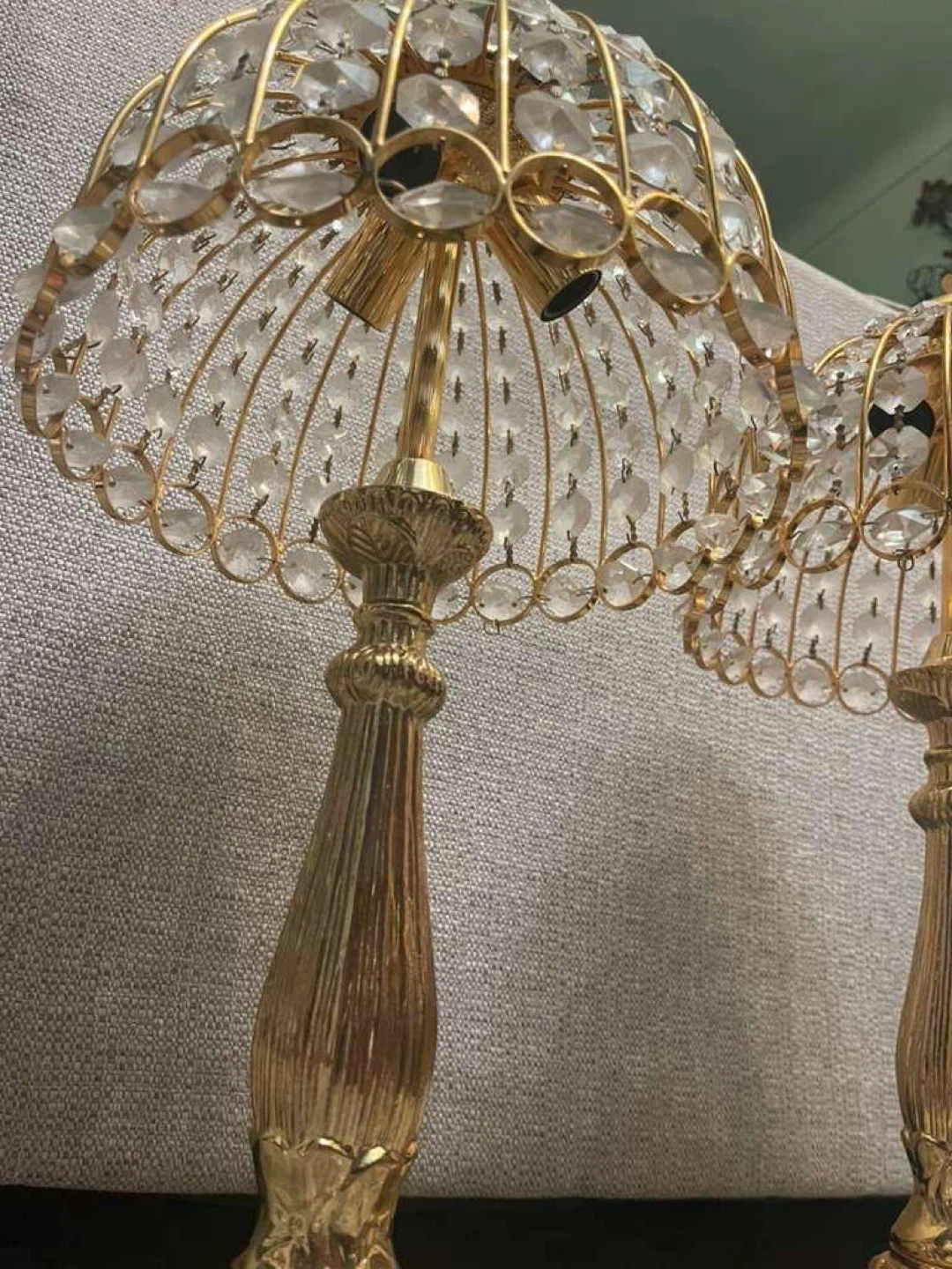 Features: The shade is a prominent "basket" or "umbrella" style, designed to refract light through the crystal strands for a glamorous effect. The bases are often ornate with a floral or scrolled pedestal design.