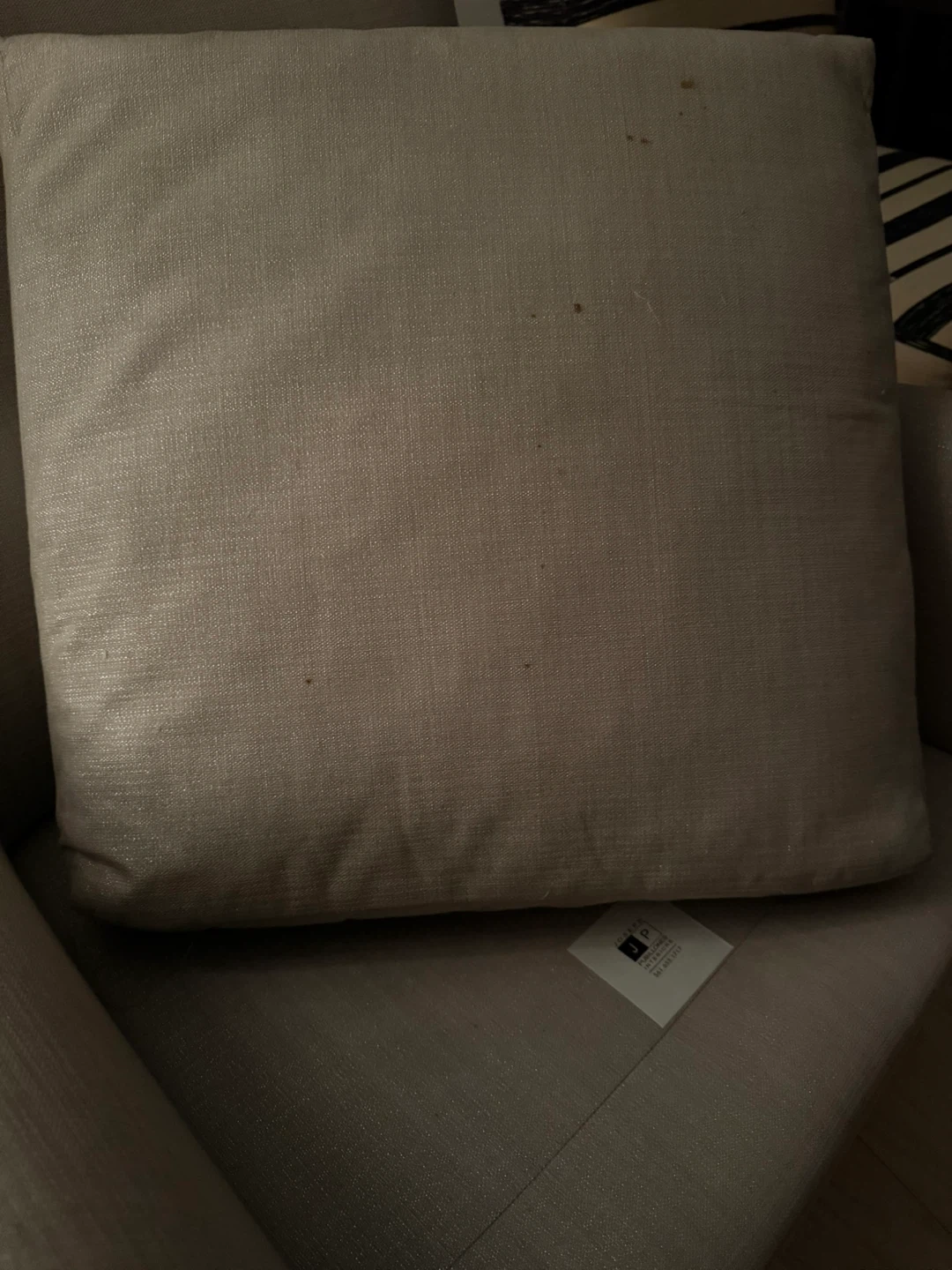 This is a light-colored accent chair with button tufting on the back. It has fabric upholstery and dark wooden legs. The chair's frame is upholstered in a textured linen-like fabric. YUP FREE