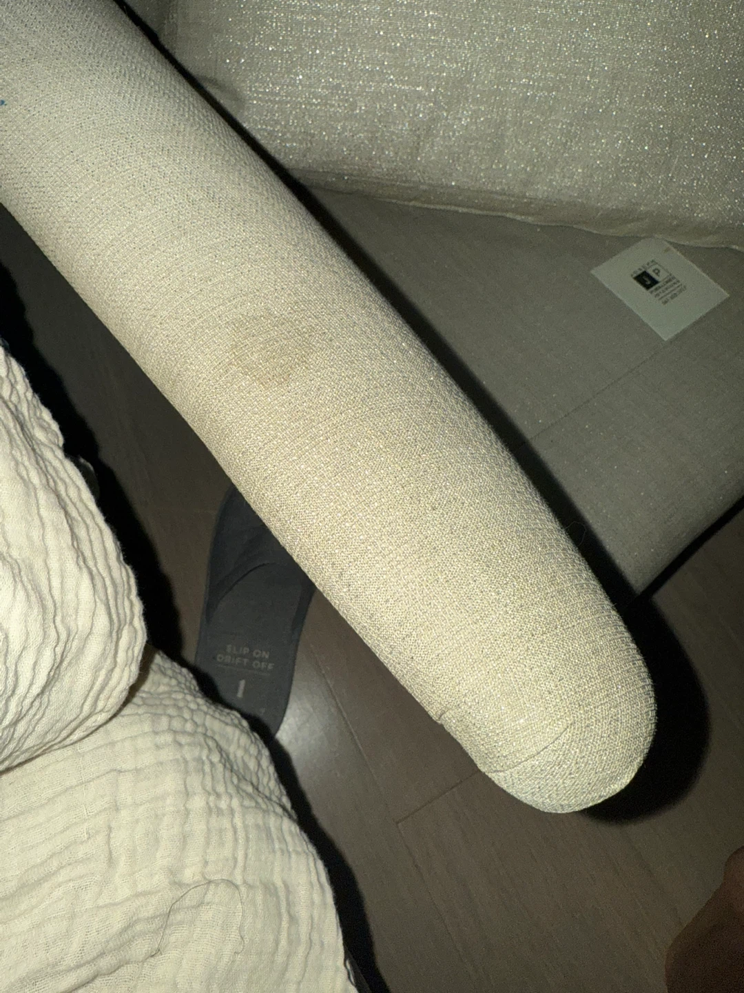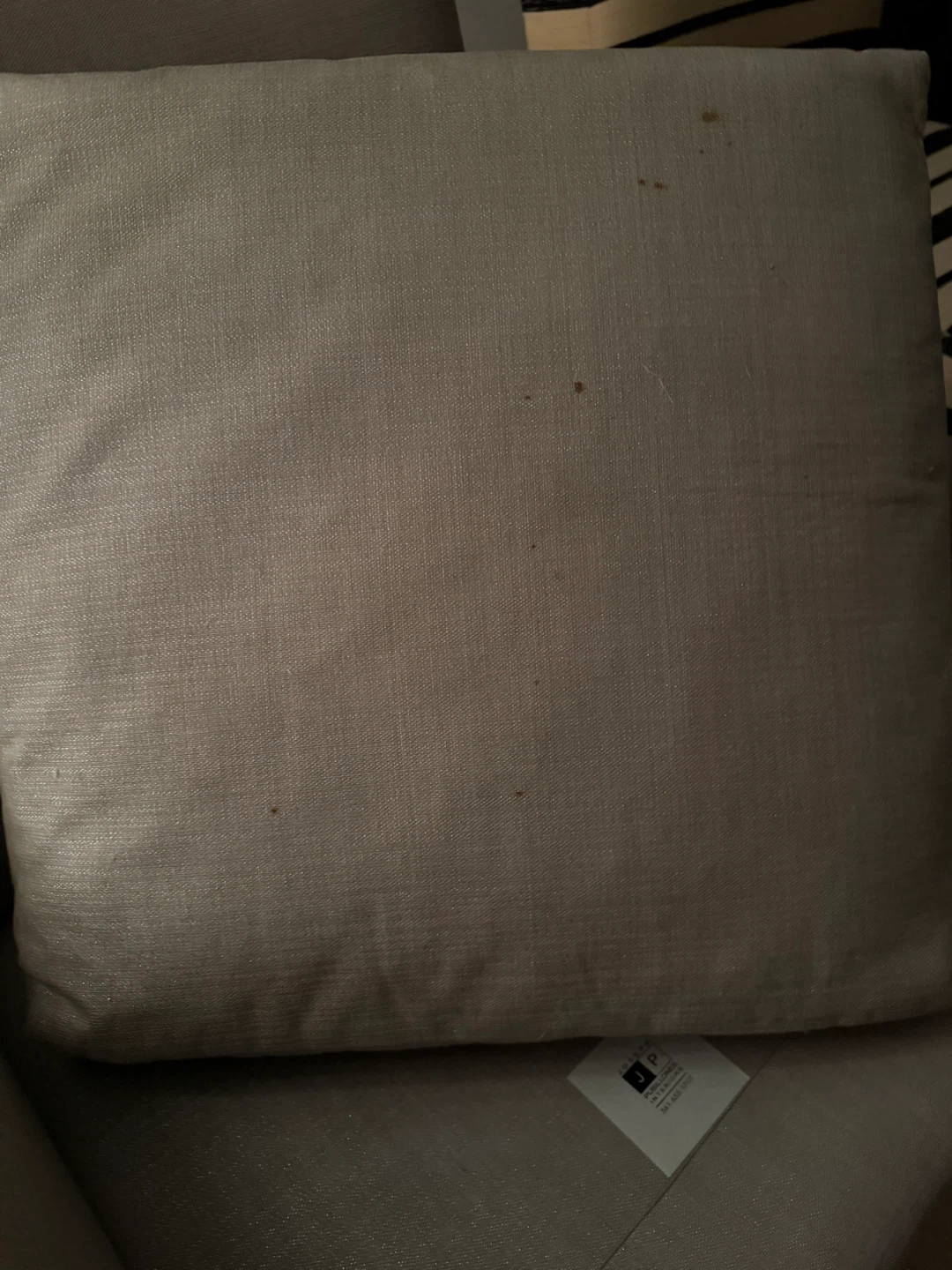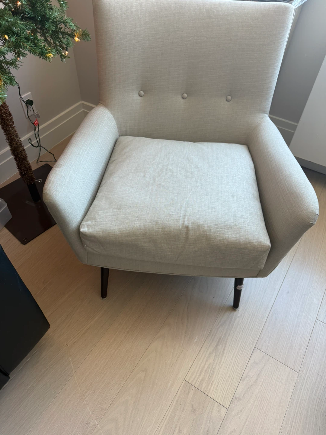 This is a light-colored accent chair with button tufting on the back. It has fabric upholstery and dark wooden legs. The chair's frame is upholstered in a textured linen-like fabric. YUP FREE