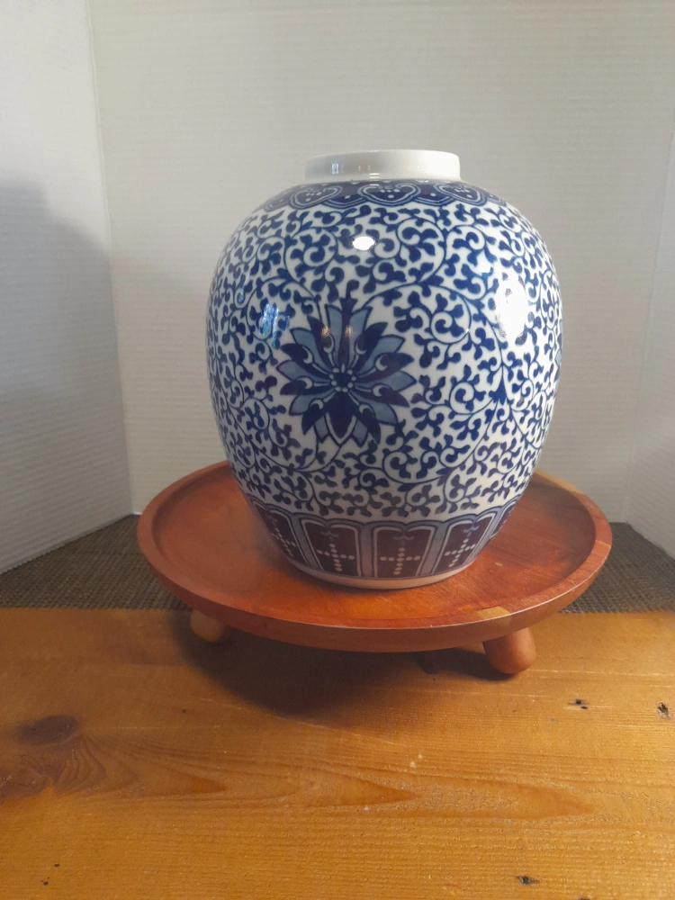 Selling a lovely ceramic vase with a beautiful blue and white pattern. It would look great as a decorative piece in any room!