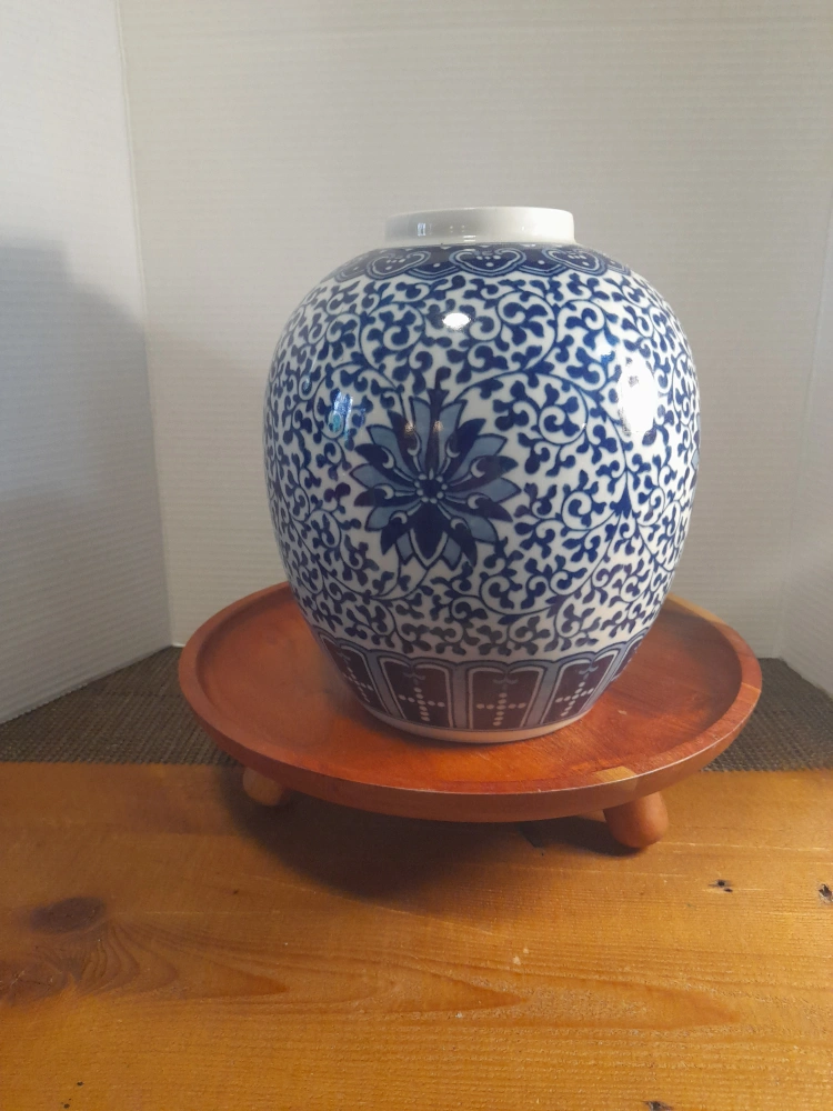 Selling a lovely ceramic vase with a beautiful blue and white pattern. It would look great as a decorative piece in any room!