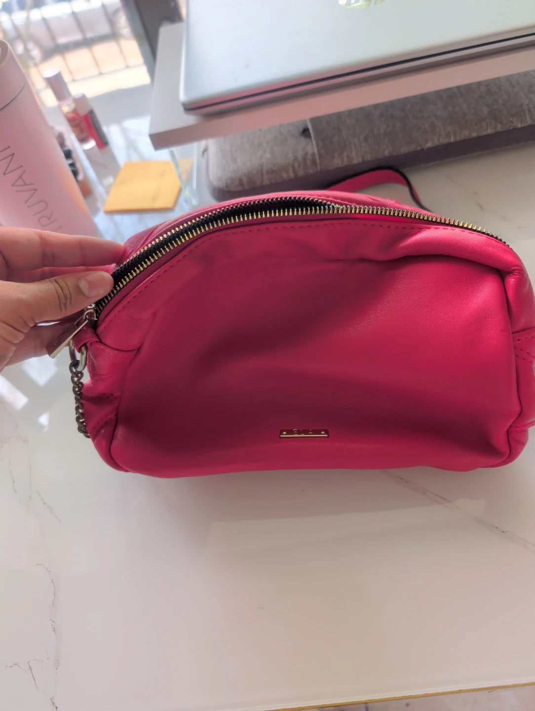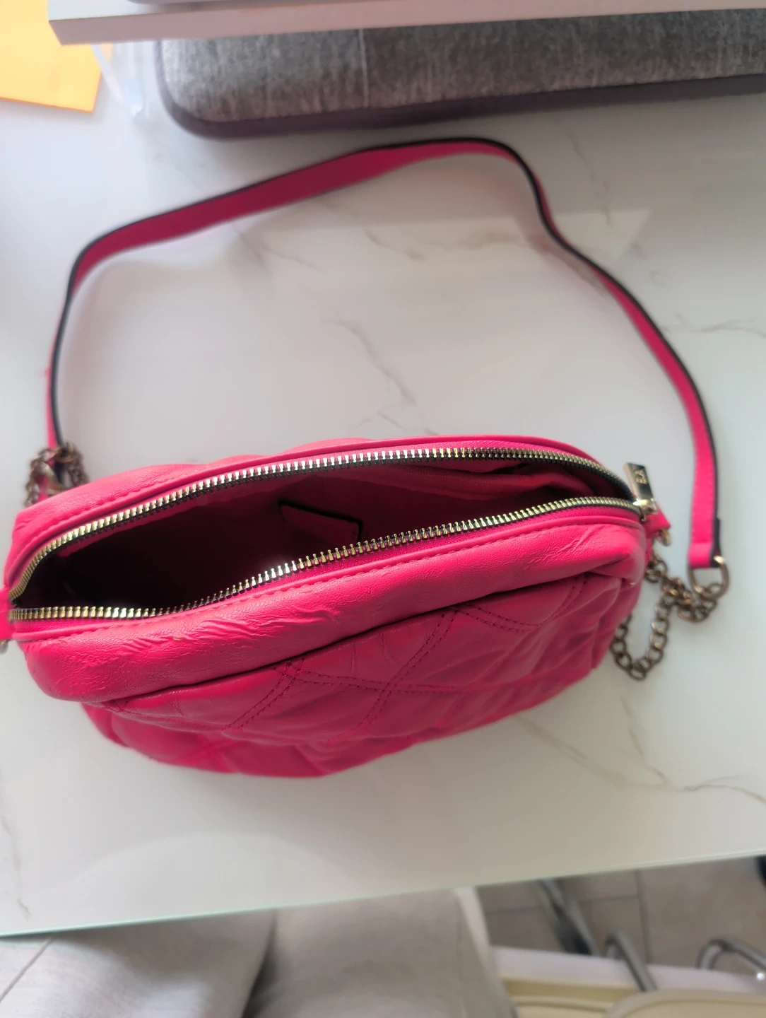 This vibrant pink crossbody bag features a stylish quilted design and a chic chain strap. It's got a zip closure to keep your essentials secure. The metallic logo plate adds a subtle touch of elegance. A great compact bag for everyday use or a night out!