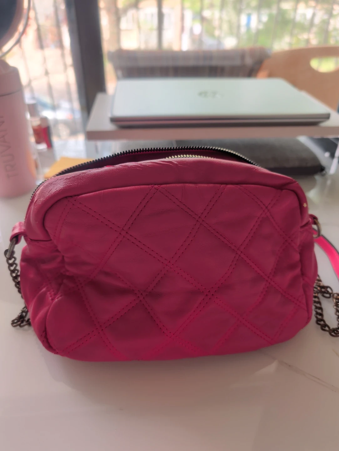 This vibrant pink crossbody bag features a stylish quilted design and a chic chain strap. It's got a zip closure to keep your essentials secure. The metallic logo plate adds a subtle touch of elegance. A great compact bag for everyday use or a night out!
