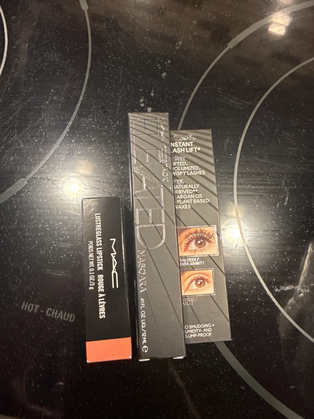 Selling a MAC Lustreglass Lipstick and MACStack Mascara. The lipstick is in the shade 'Hug Me'!