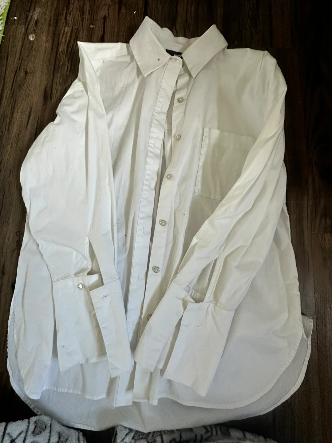 White button-up shirt from DKNY. It has a classic collar and button cuffs. The material feels like a cotton blend.