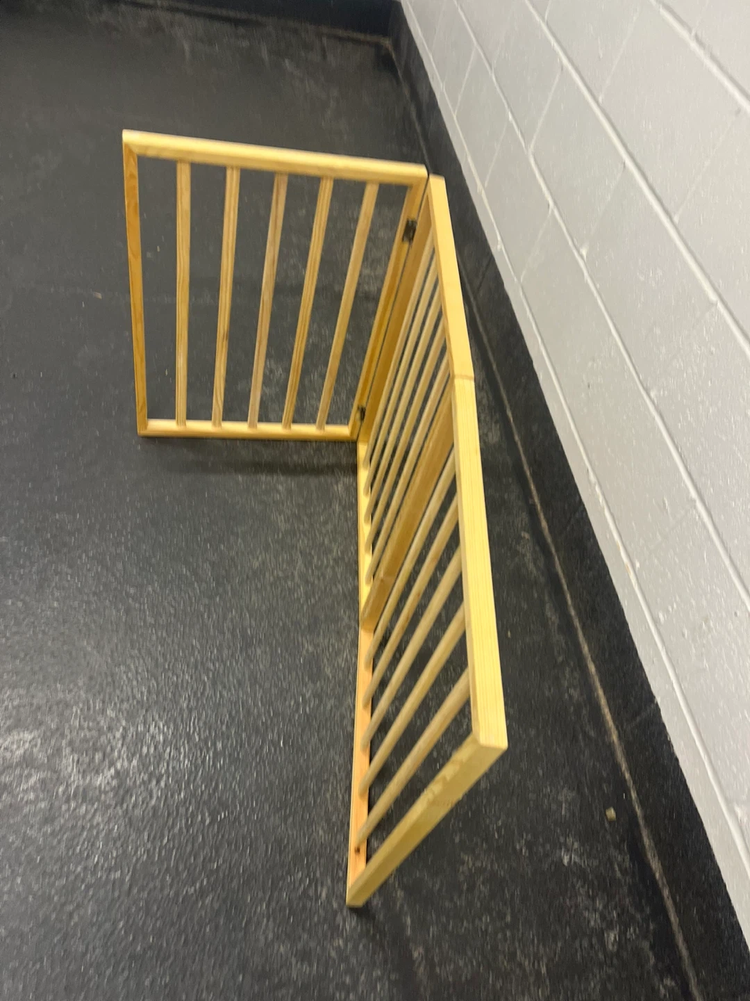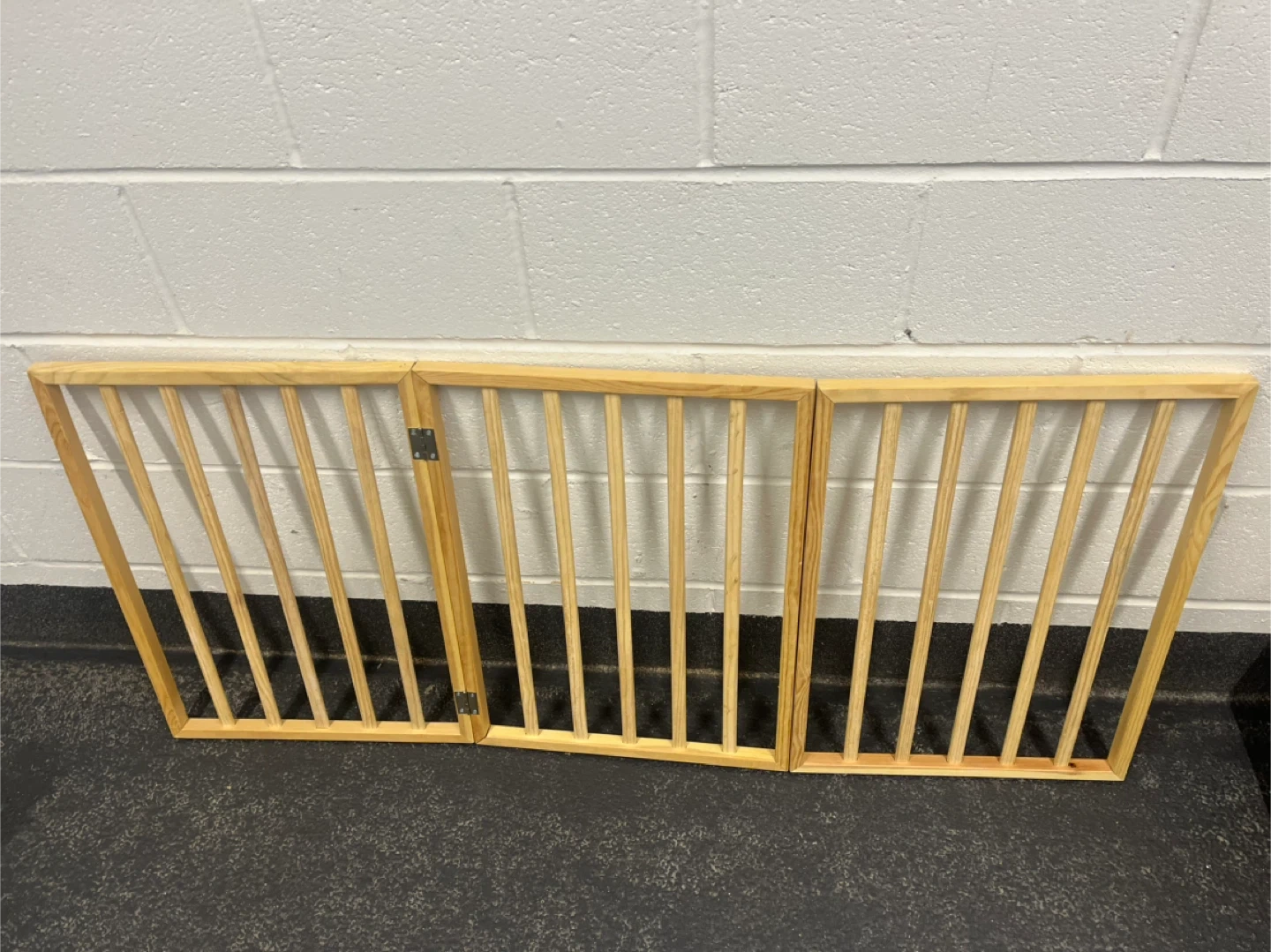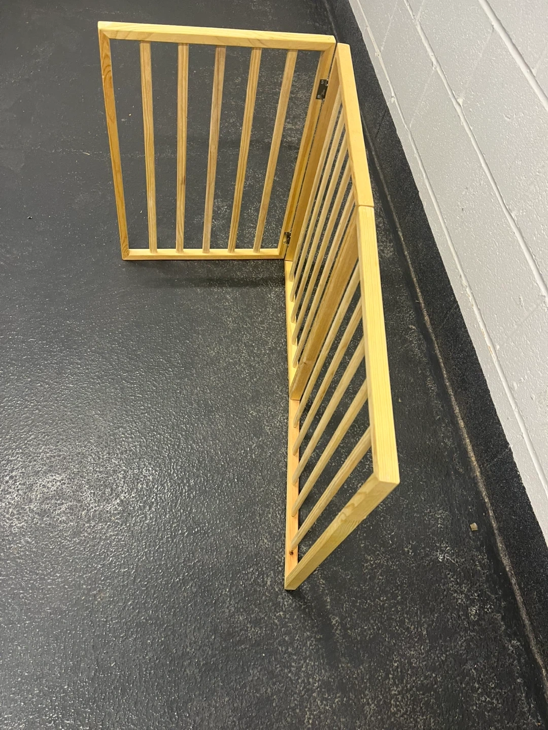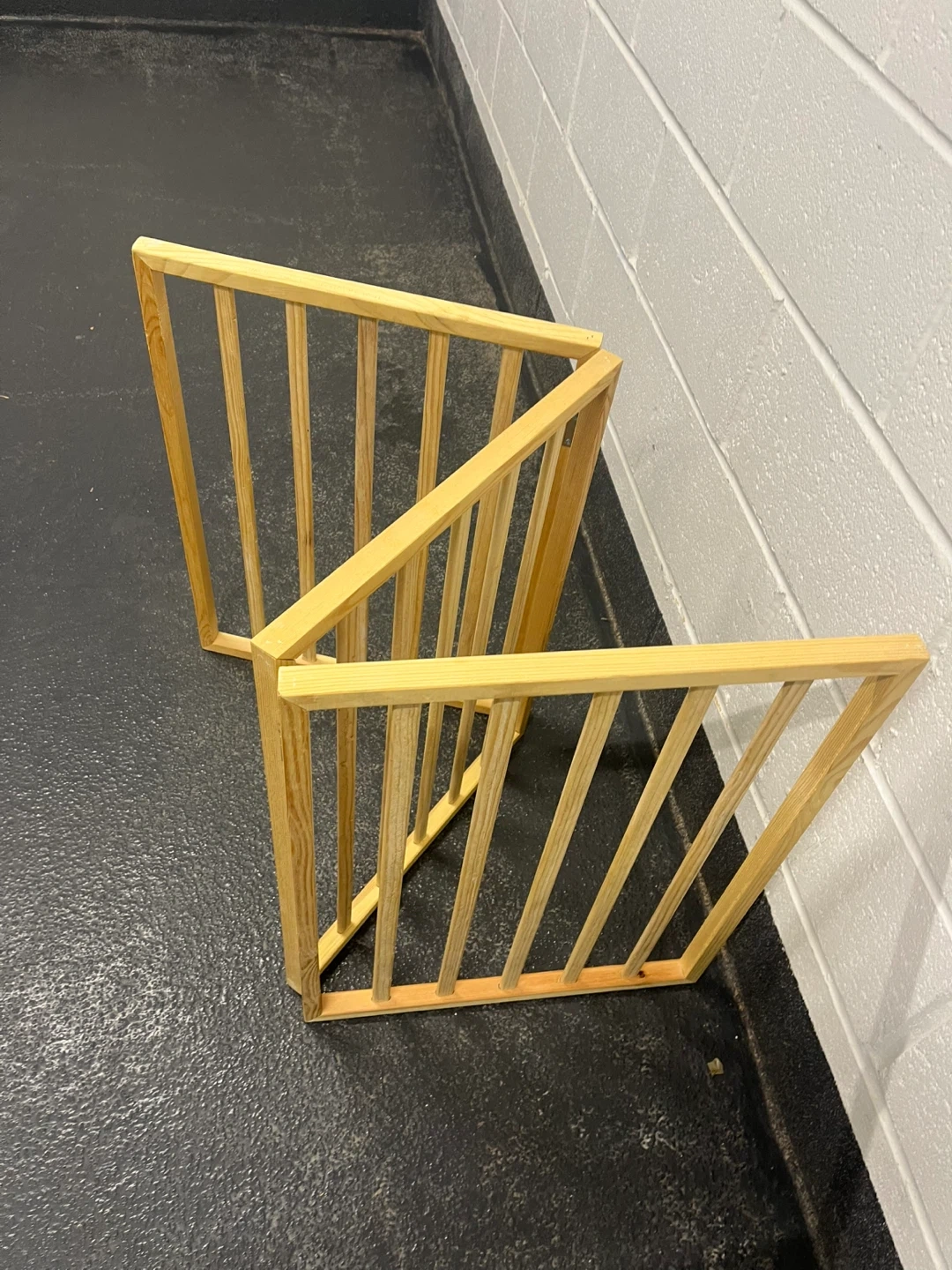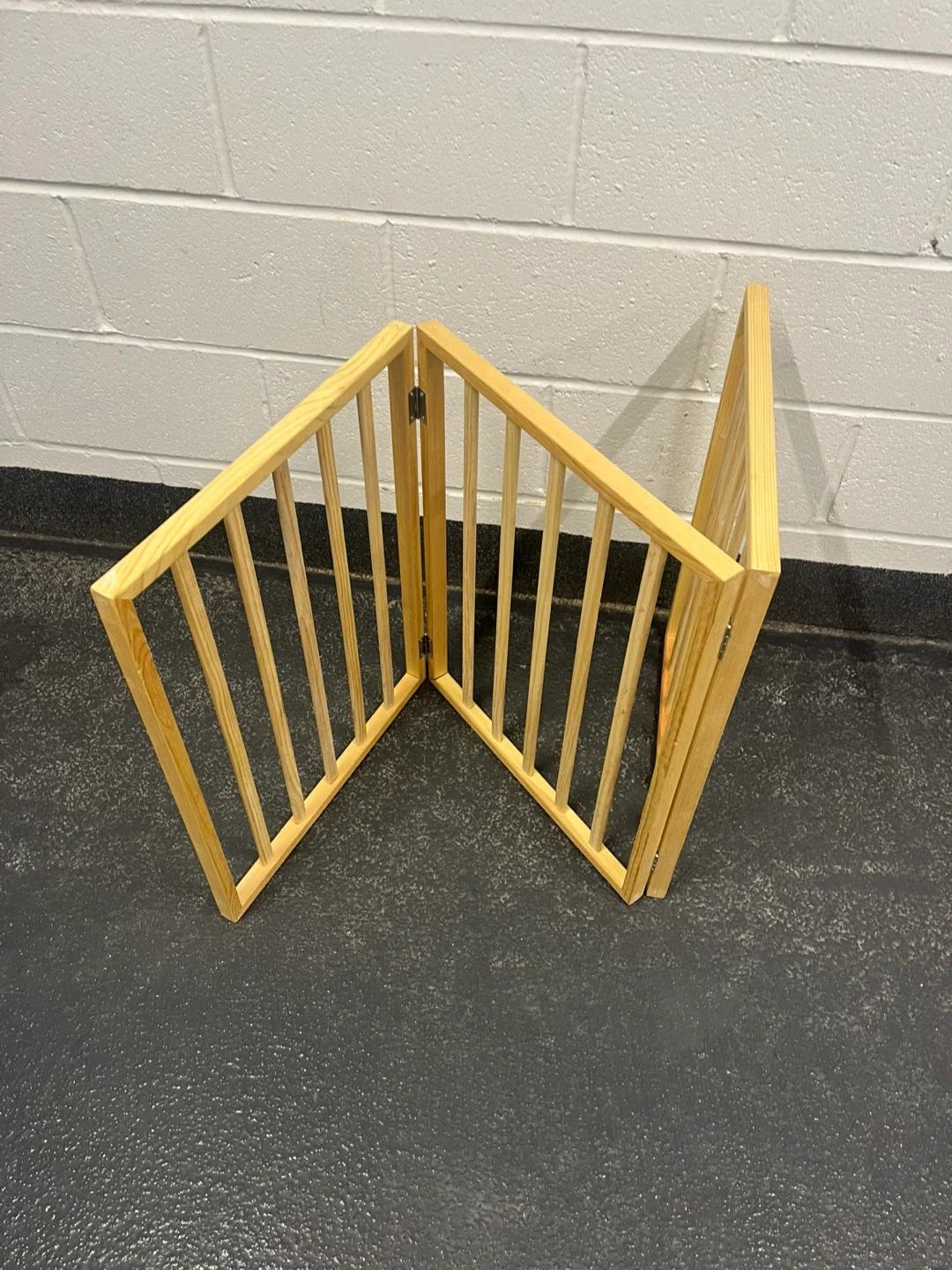 A three-panel wooden pet gate made of pine. It's freestanding and can be configured in various ways. Great for keeping pets contained in specific areas!