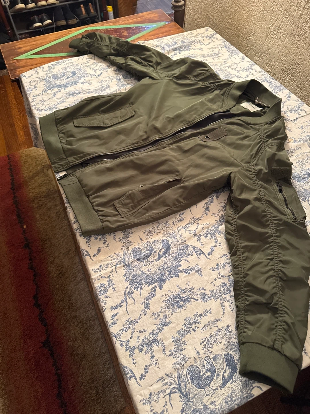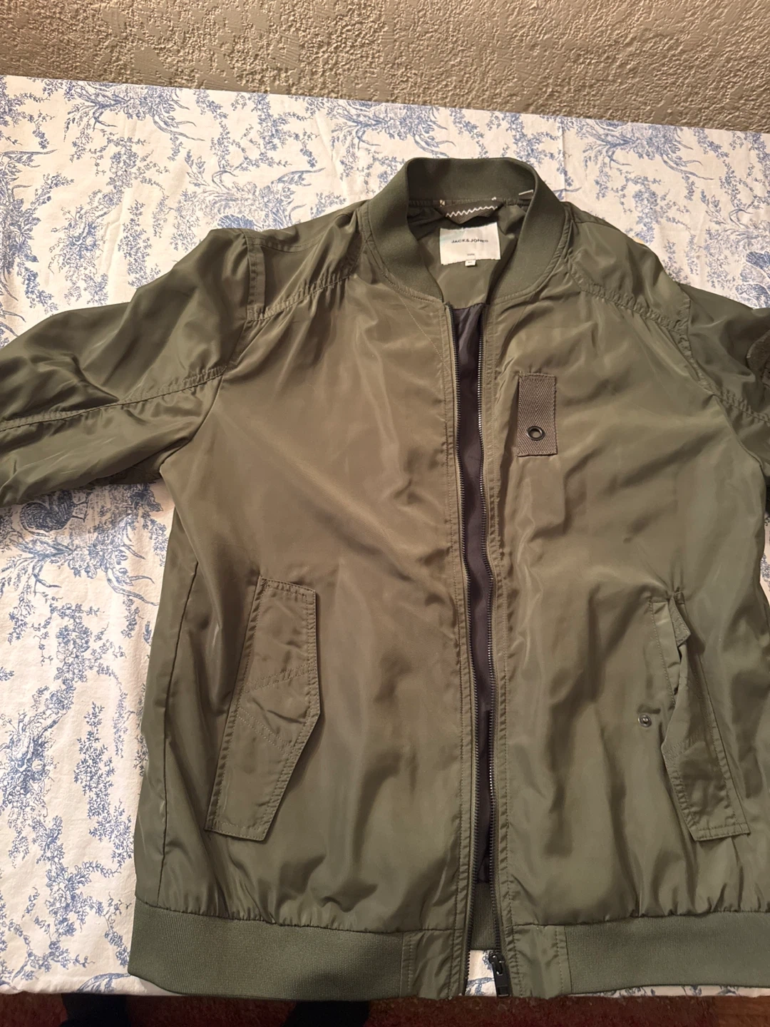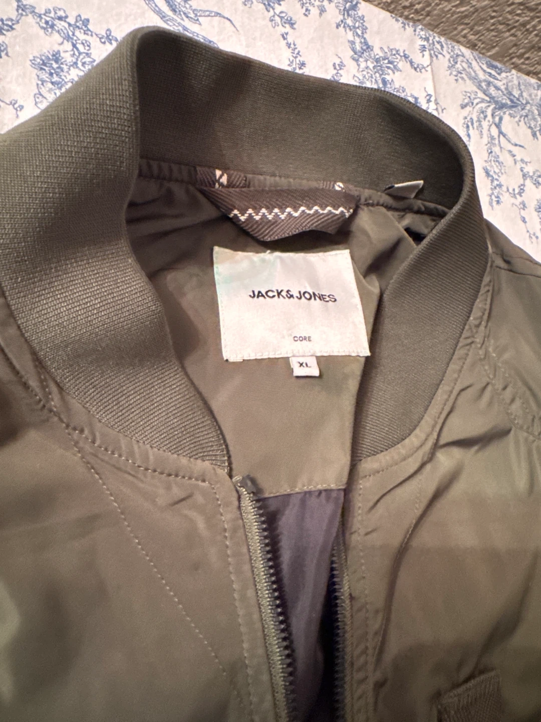 Olive green bomber jacket from JACK & JONES CORE. Features a zip-up front and multiple pockets. Made from a lightweight shell material. Size XL.
