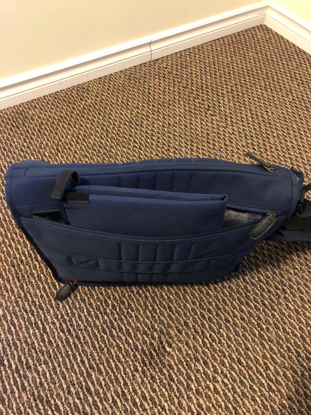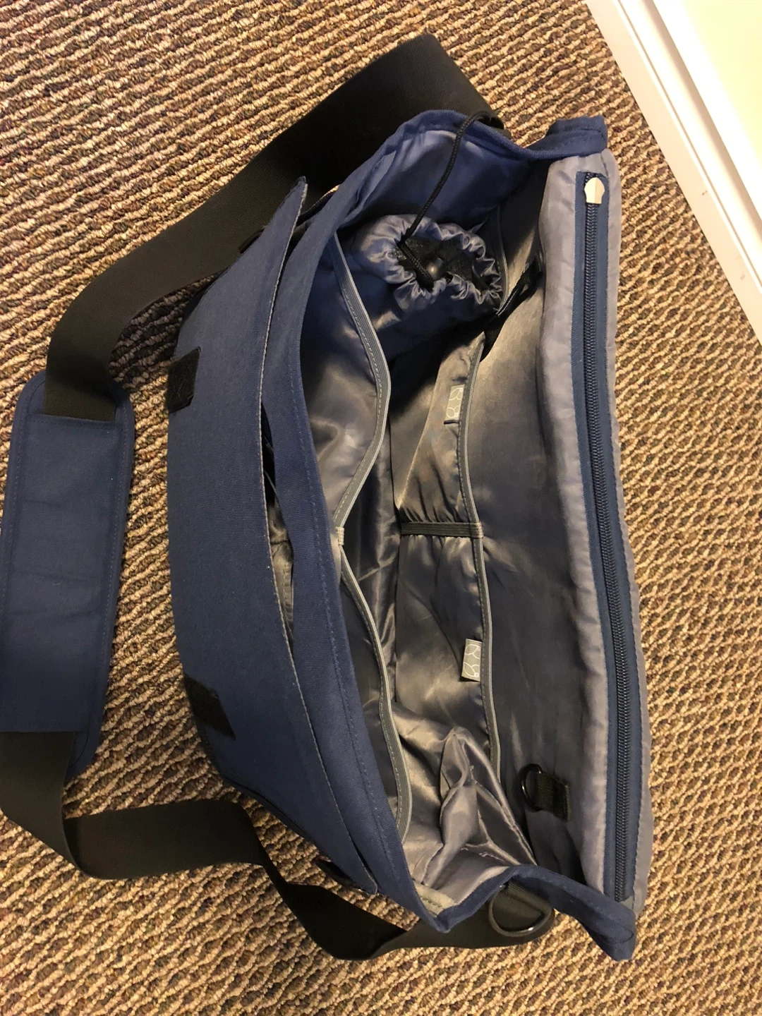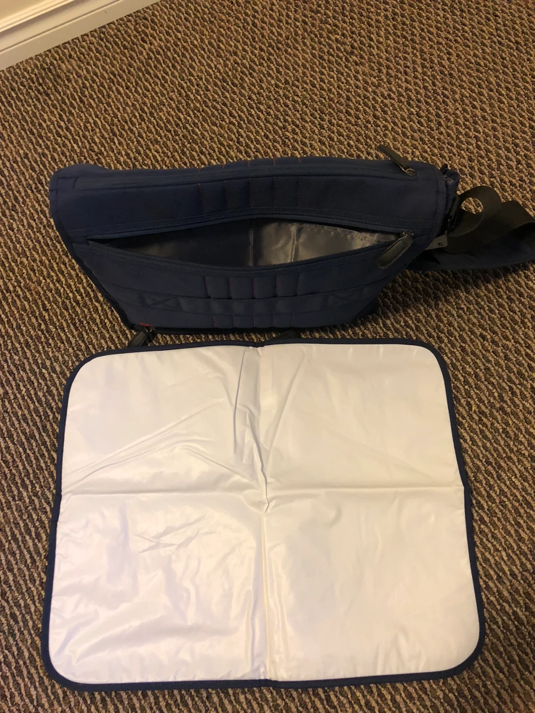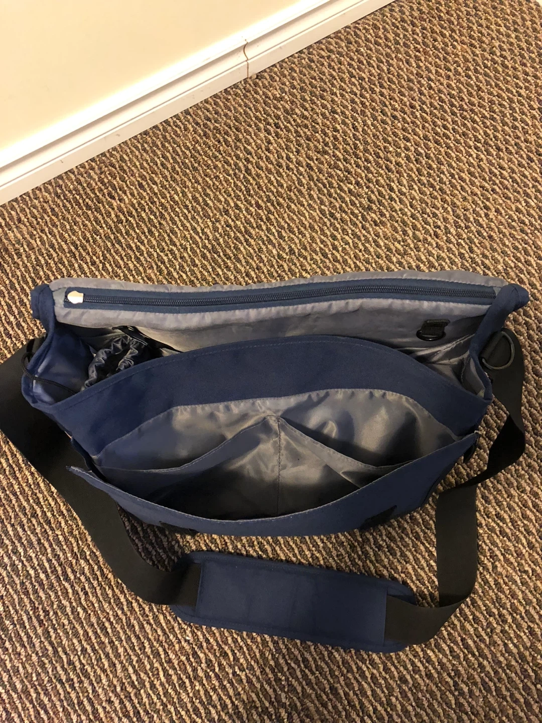 Spacious diaper bag in a nice navy blue colour. It features multiple interior pockets for organization and a changing pad. The adjustable shoulder strap makes it comfy to carry.