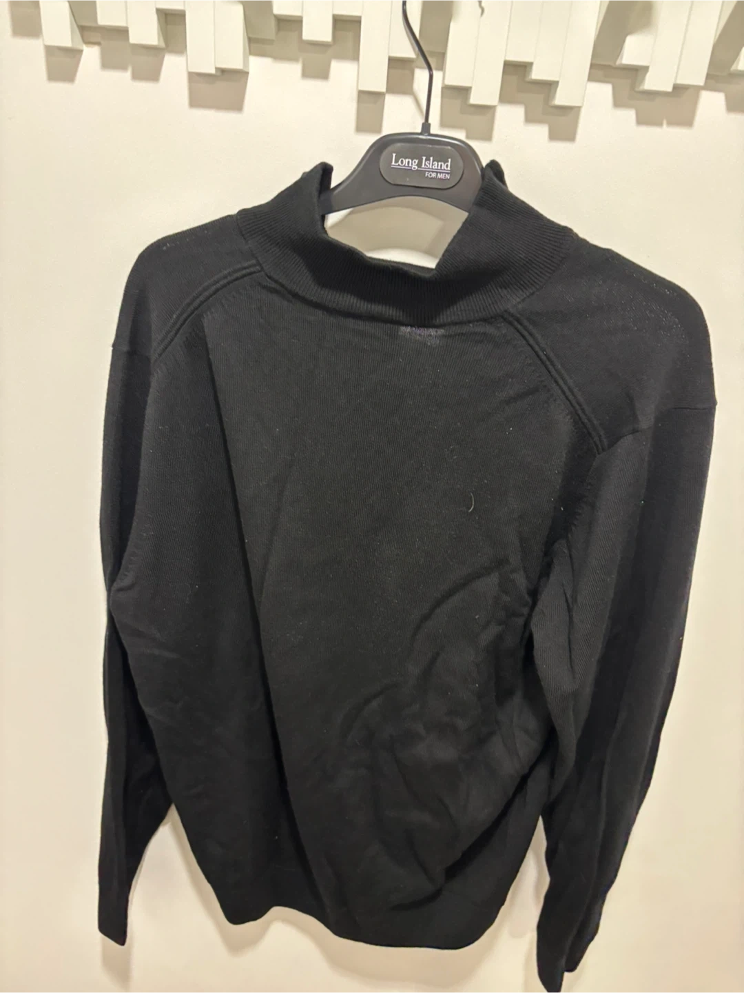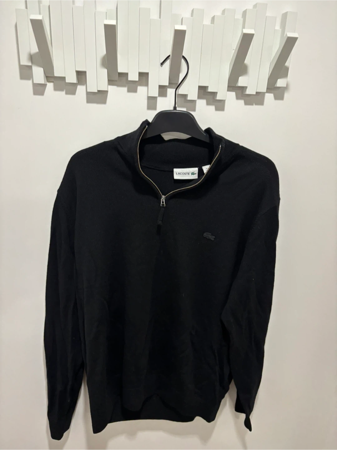 This is a classic black Lacoste quarter-zip pullover. The material feels great and it’s in good condition. Perfect for layering or wearing on its own!