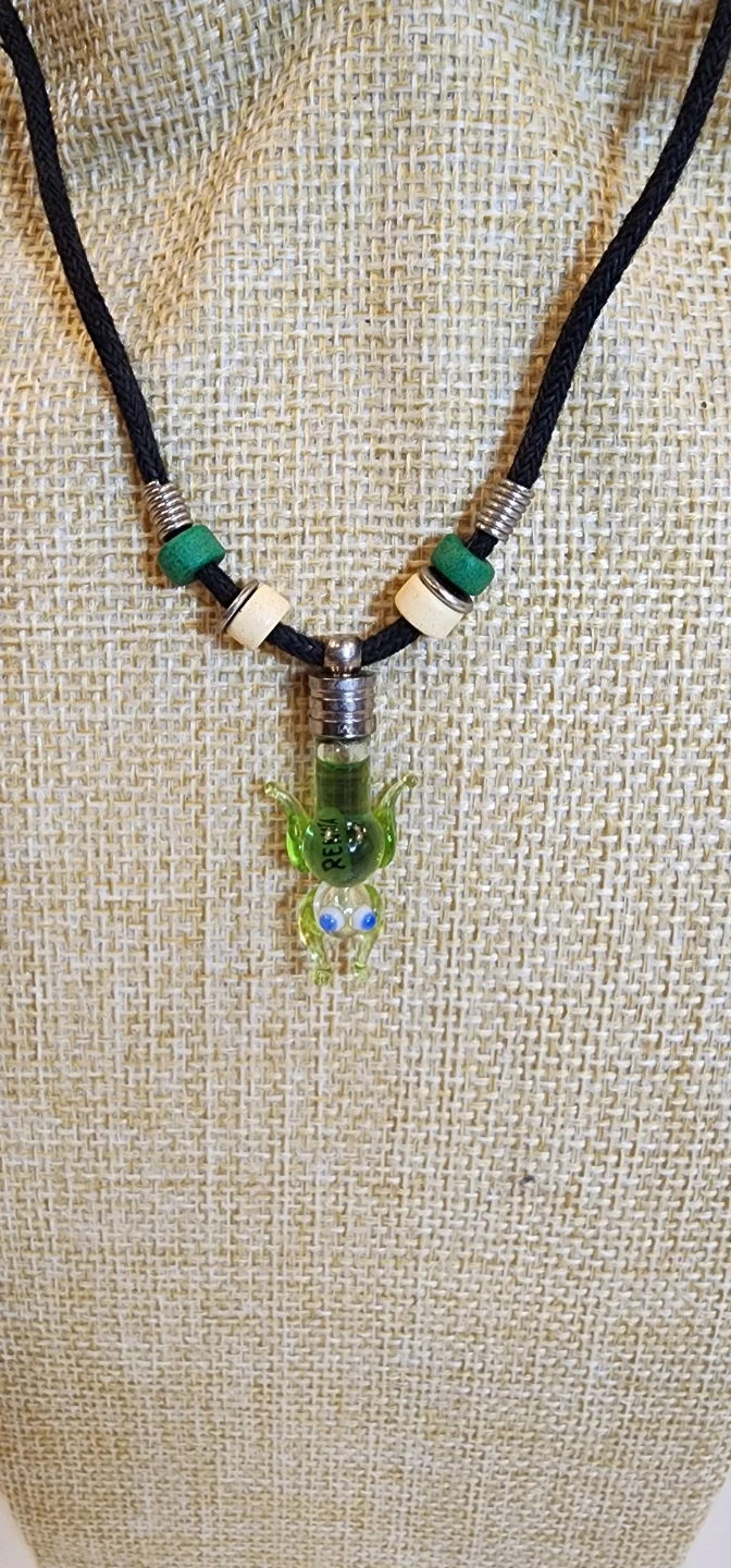 Here's a unique green glass perfume necklace! It features a small glass container that can hold perfume, attached to a black cord necklace with decorative beads. It's a fun and stylish way to keep your favourite scent close by