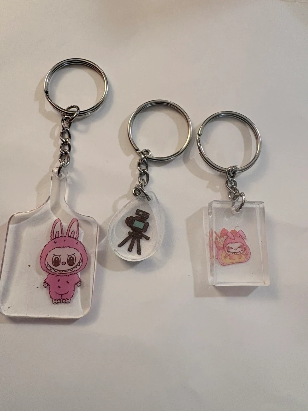 Lalabu Set includes three unique resin keychains. One features a pink bunny character on a shield shape, another a mini camera on a teardrop shape, and the third a pink character in a rectangular shape. These're great for personalizing backpacks or keys!