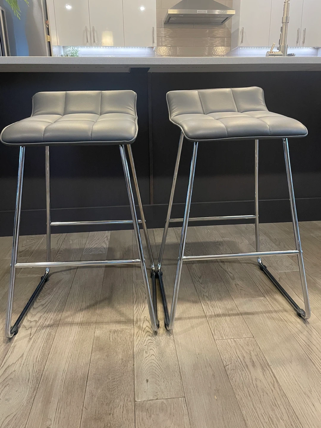 Selling a set of two bar stools from Bouclair! They have a sleek, modern look with a grey seat and chrome legs. Very sturdy built .The seat is made of polyurethane foam. Great for adding some style to your kitchen or bar area.90$ for two.