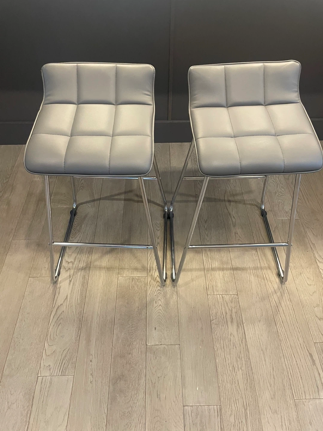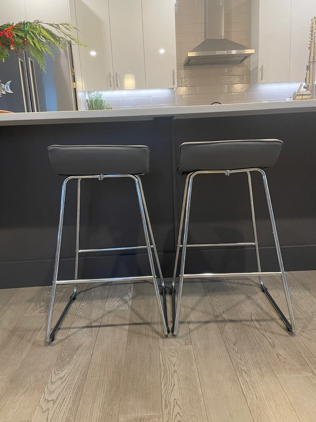 Selling a set of two bar stools from Bouclair! They have a sleek, modern look with a grey seat and chrome legs. Very sturdy built .The seat is made of polyurethane foam. Great for adding some style to your kitchen or bar area.90$ for two.