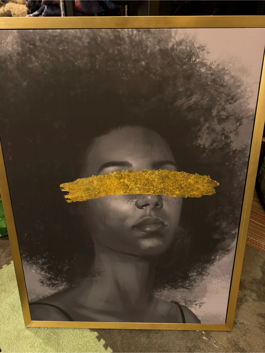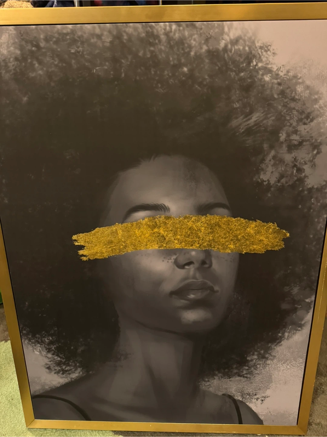 Framed art print featuring a black and white illustration of a woman with a large afro. A textured gold bar obscures her eyes. It's a striking piece for any wall! Frame is a simple gold finish.