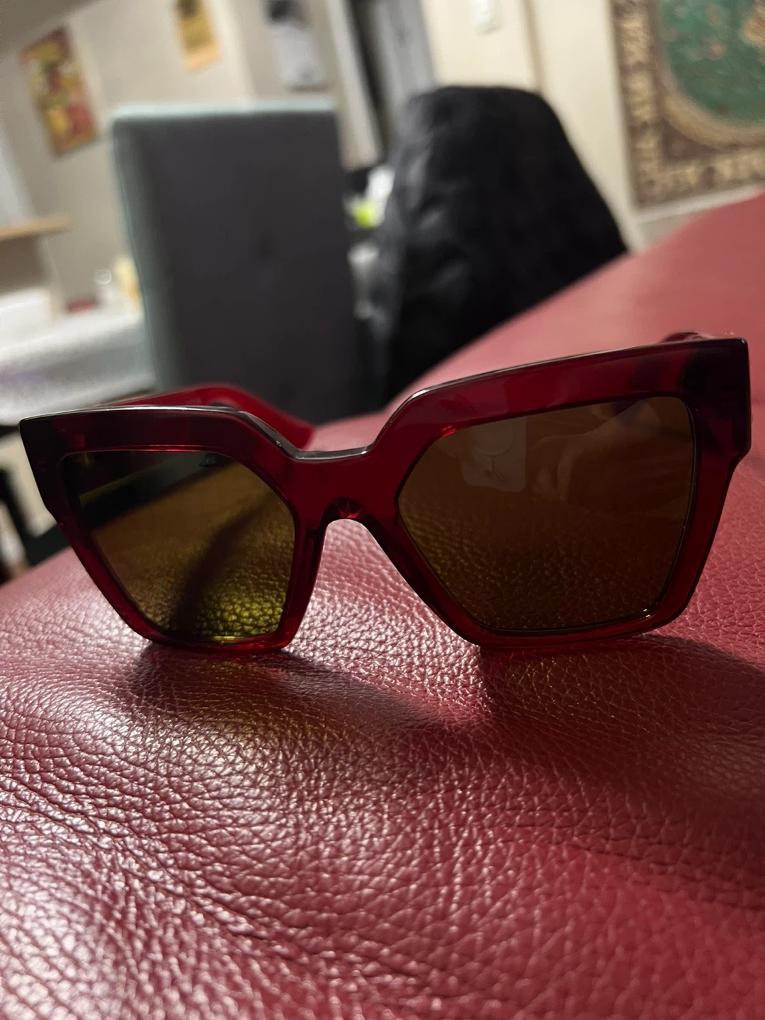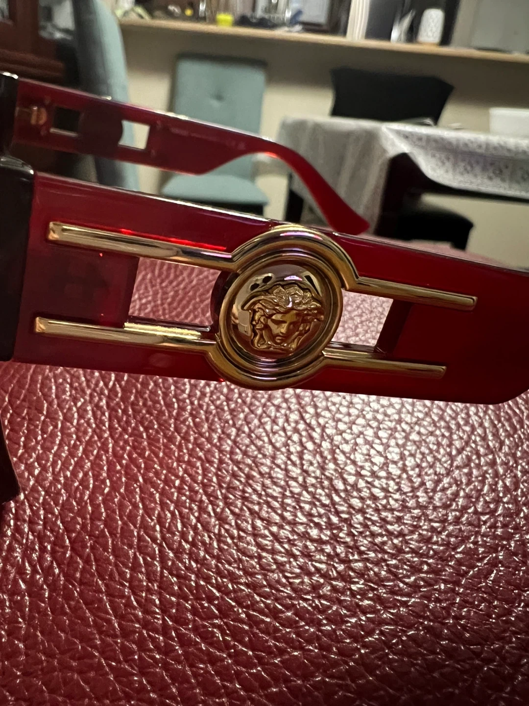 These Versace sunglasses boast a bold, angular design in a deep burgundy color. They feature the iconic Medusa head emblem on the gold-toned accents at the temples. The lenses are tinted for eye protection. Coming with original case.