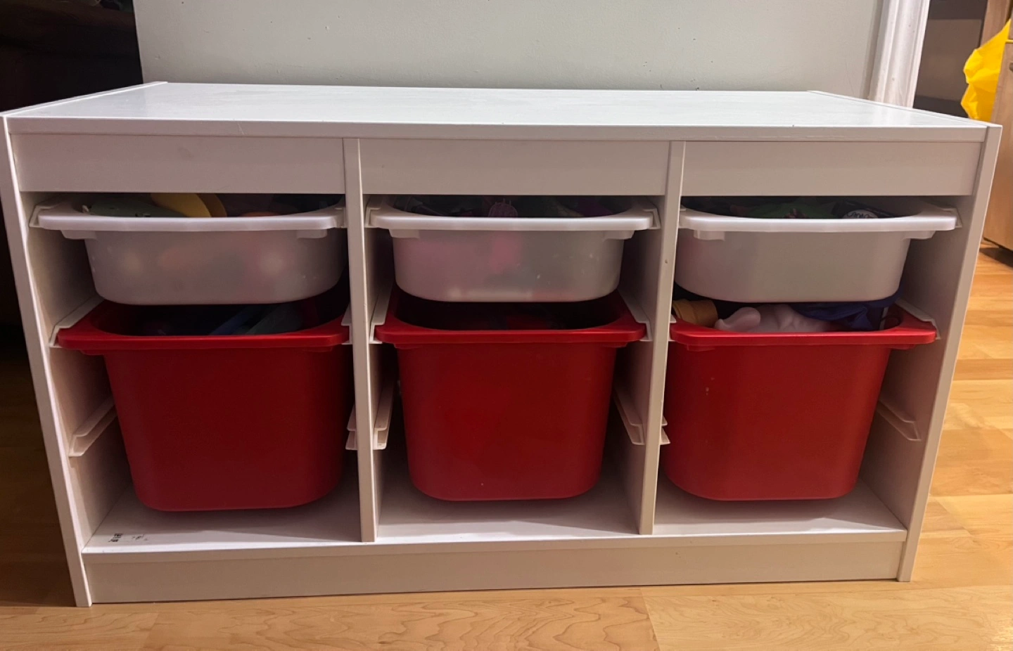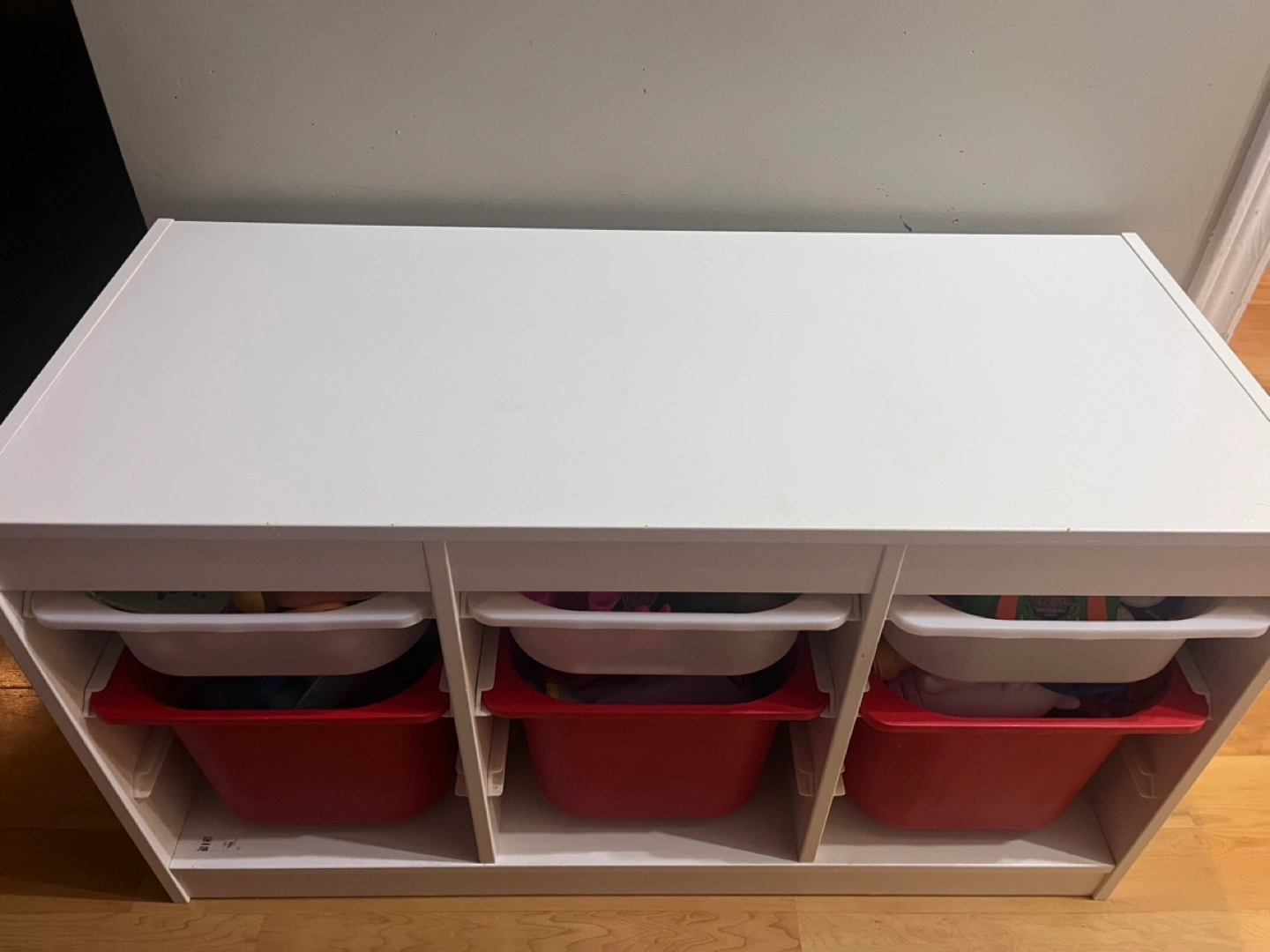White storage combination with three red bins and three smaller white bins. Ideal for children's toys or other storage needs. Good condition.