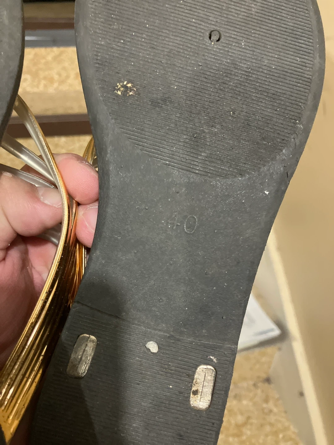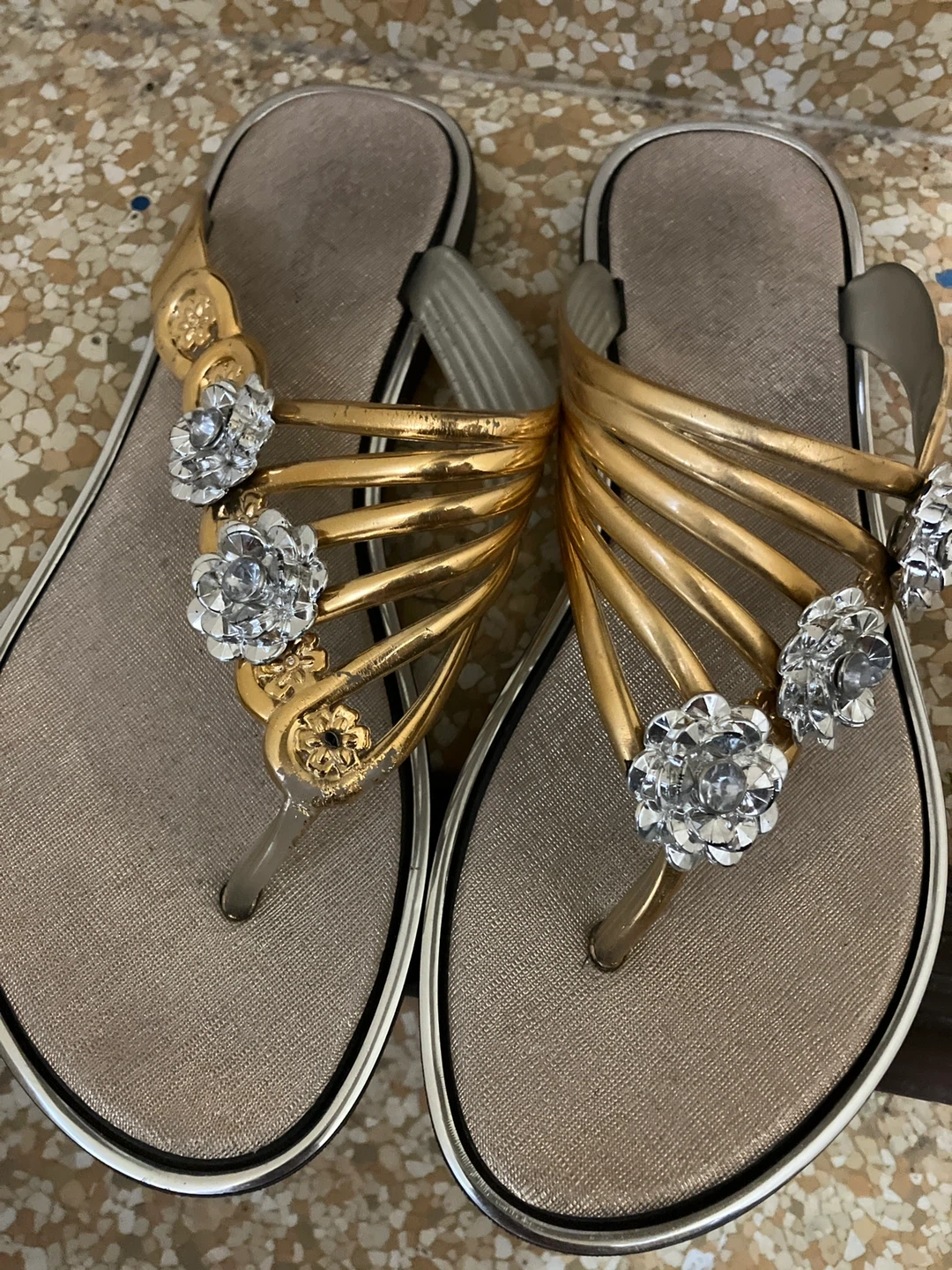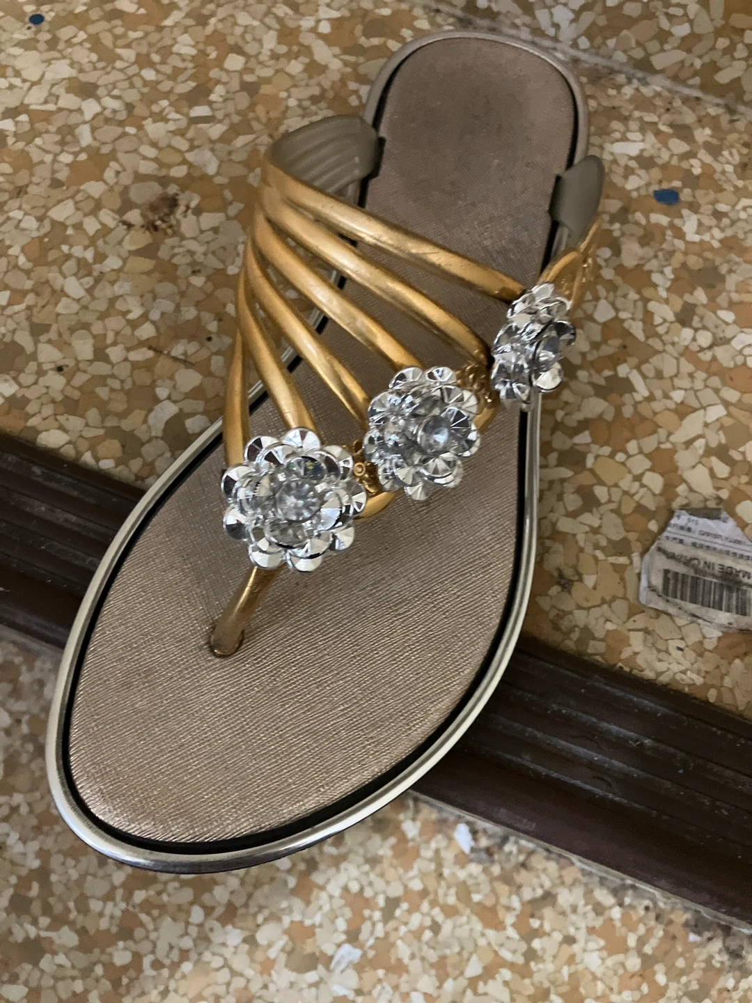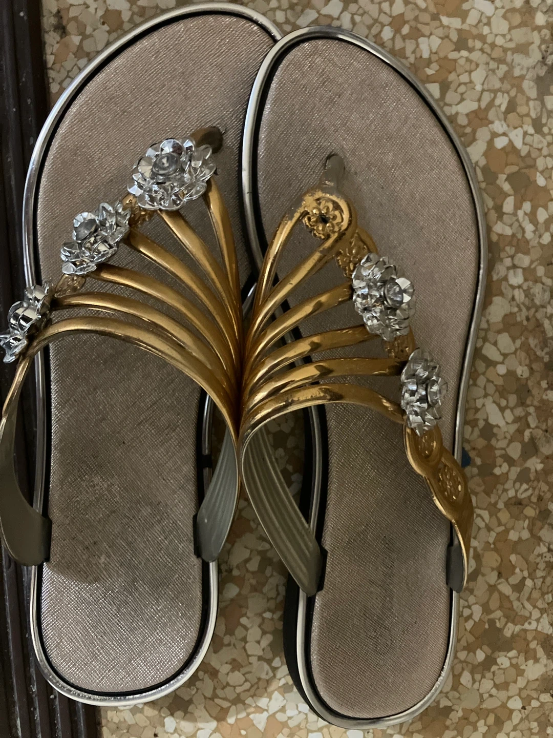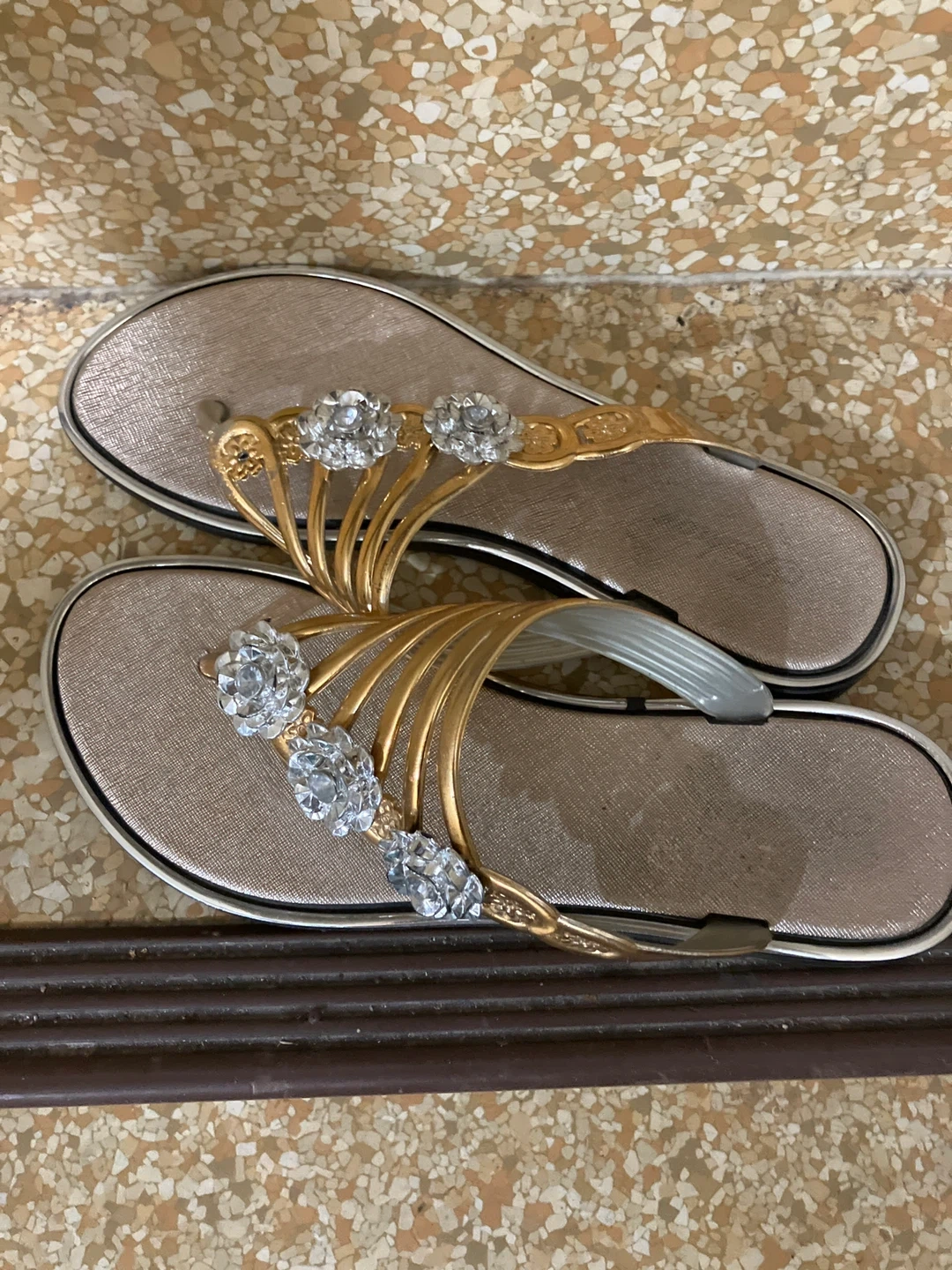 These stylish thong sandals feature a gold metallic design with a series of straps adorned with clear rhinestones. The footbed is a soft, champagne-coloured material with a textured black sole. Size 40.