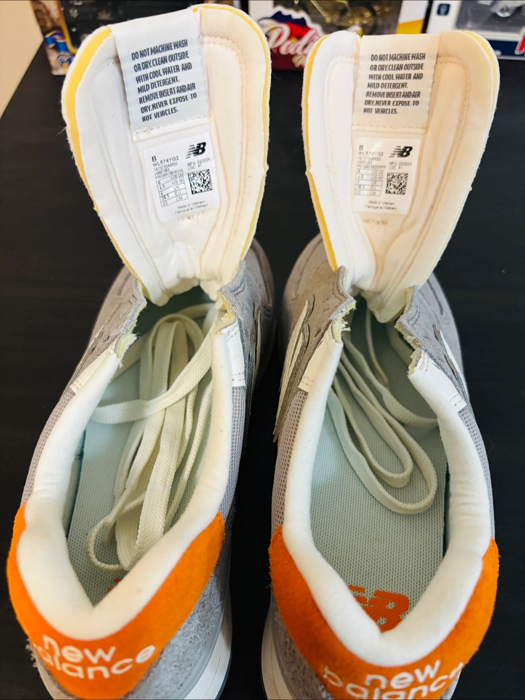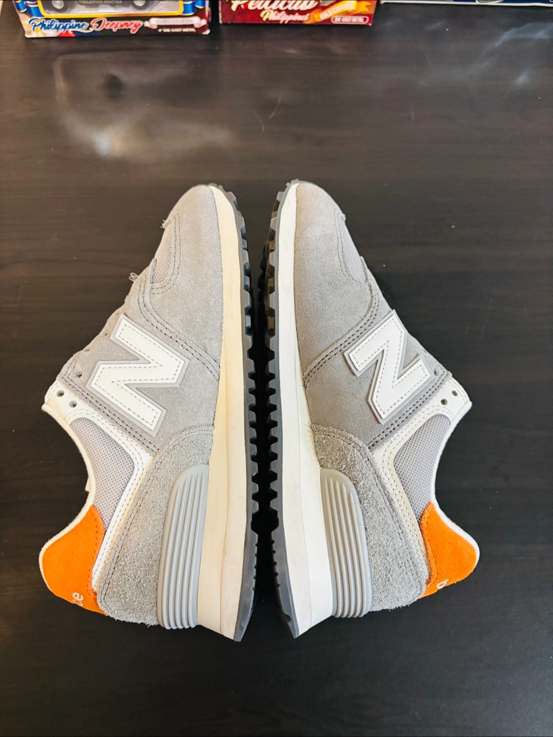 Selling a pair of New Balance 574 sneakers in a stylish grey and orange colourway. These are a US size 8.5. The soles show some signs of wear, but they're still in good condition for everyday wear.