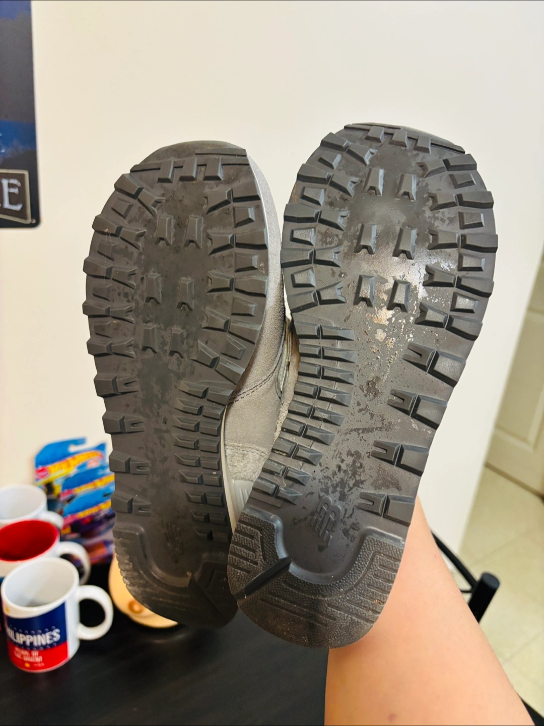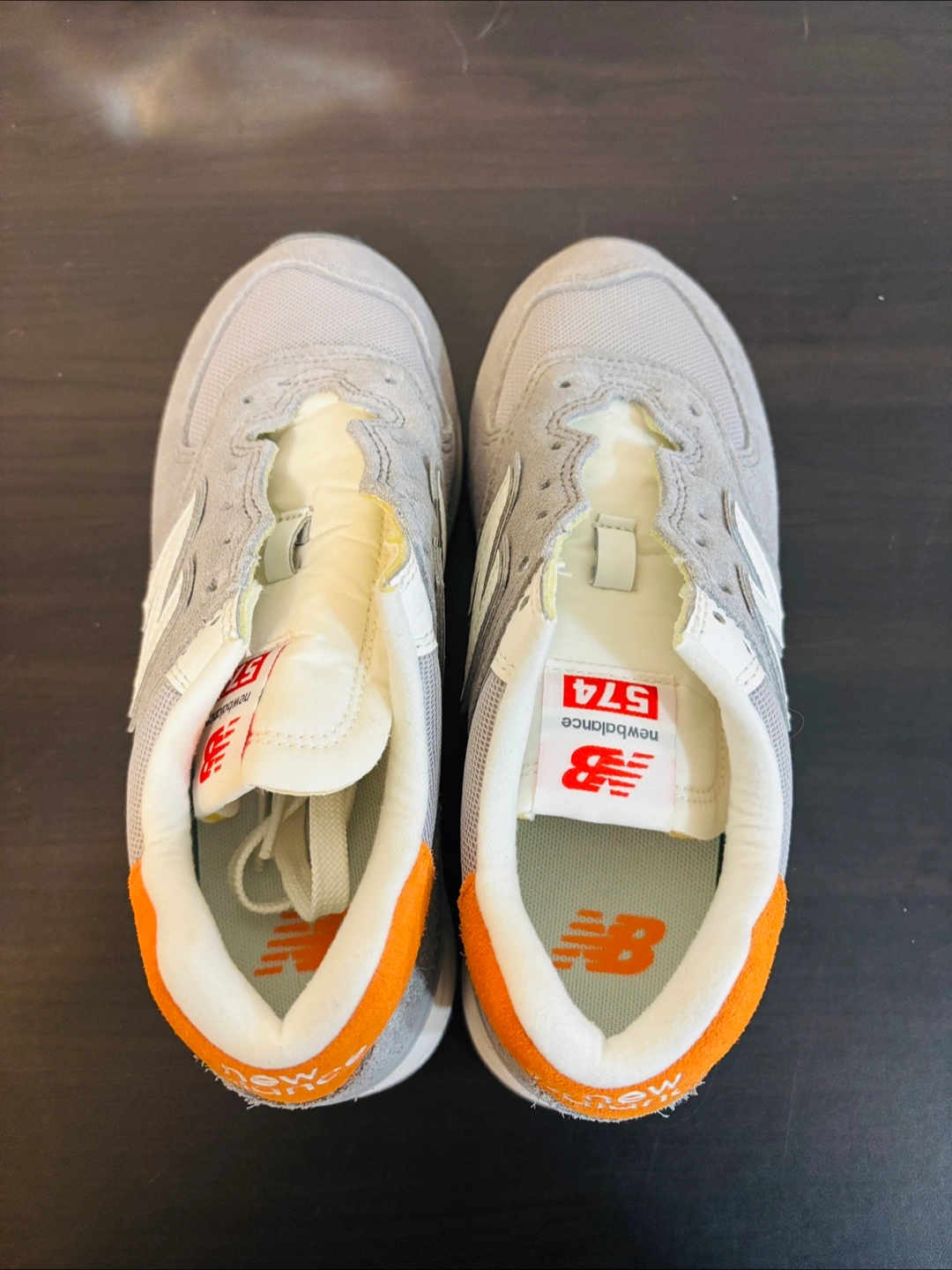 Selling a pair of New Balance 574 sneakers in a stylish grey and orange colourway. These are a US size 8.5. The soles show some signs of wear, but they're still in good condition for everyday wear.