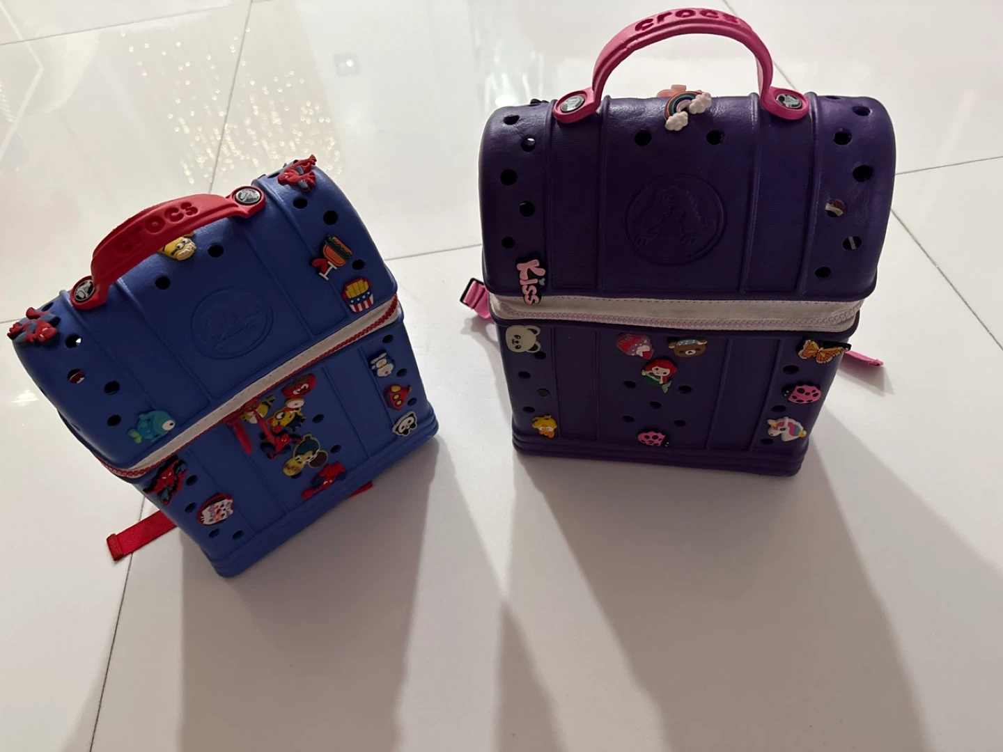 Two fun Crocs backpacks for kids. One is blue with red straps and Jibbitz, the other is purple with pink straps and Jibbitz. They're perfect for toddlers and young children to carry their essentials.