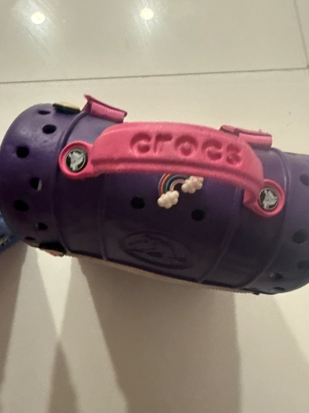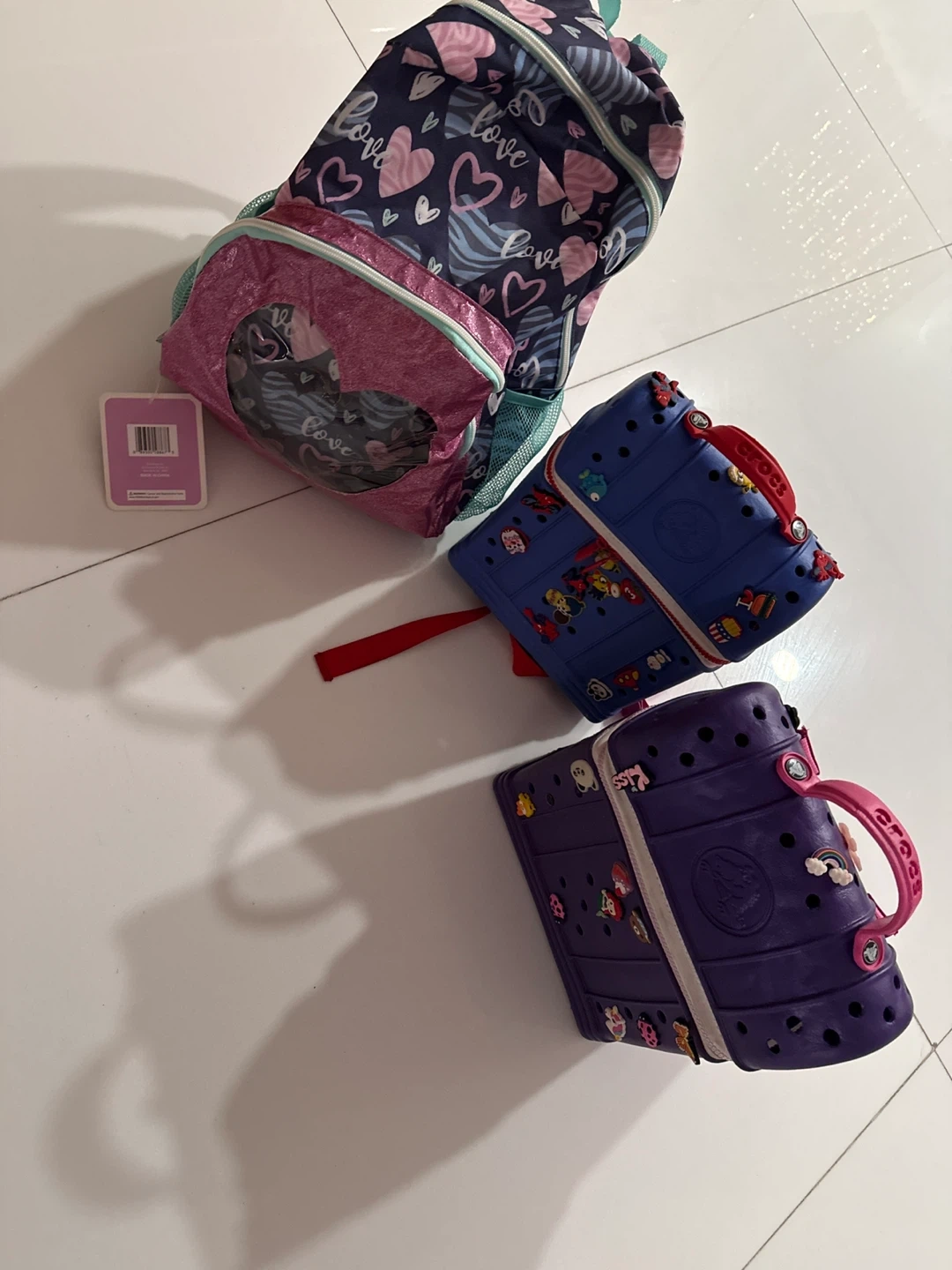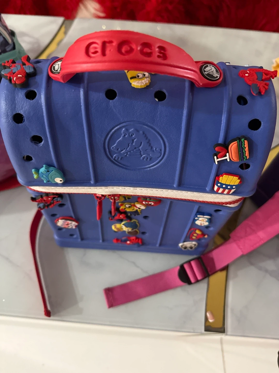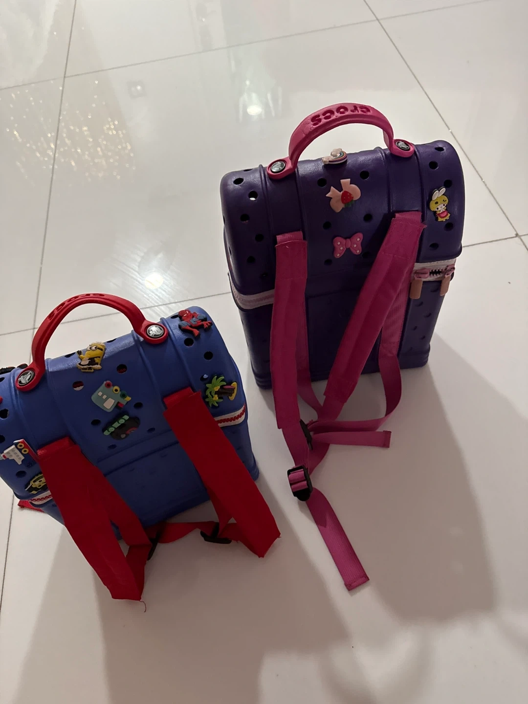 Two fun Crocs backpacks for kids. One is blue with red straps and Jibbitz, the other is purple with pink straps and Jibbitz. They're perfect for toddlers and young children to carry their essentials.