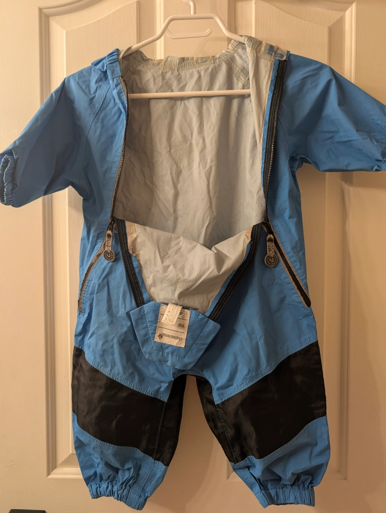 Here's a Callikids rain suit in size 18M! It's blue and black, perfect for keeping your little one dry on those rainy days. It has a hood and zips up the front.
