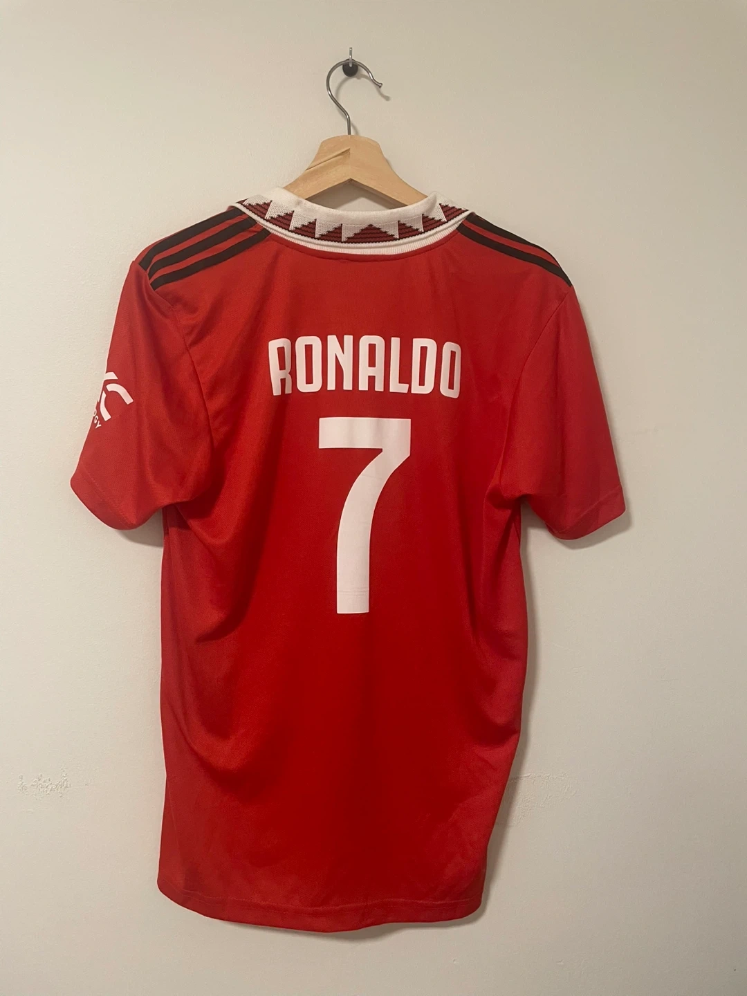 Selling a red Adidas Manchester United jersey with Ronaldo's name and number 7 on the back! A little worn but still in decent condition.