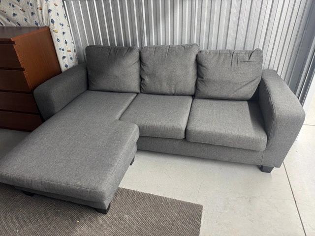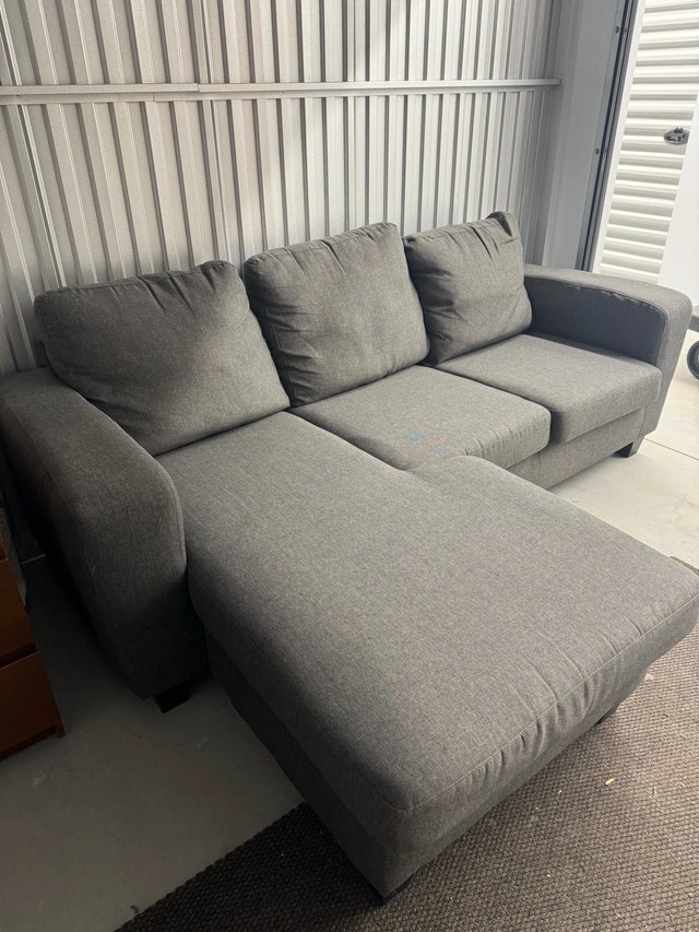 This is a grey three-seater sofa with a left-side chaise. The chaise can be switched to the right side. It's perfect for relaxing in your living room. The sofa is in good condition, showing some signs of wear and tear from use, but is still comfortable and functional. The cushions are plush, and the chaise provides extra lounging space. Self-pickup is available in the Markham area at Kennedy & Steeles. Cash is accepted.