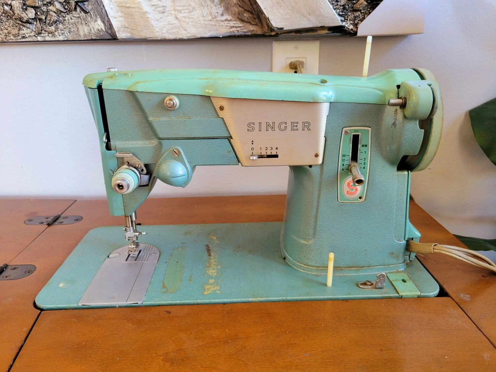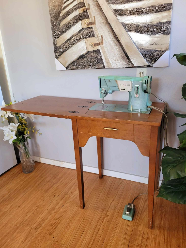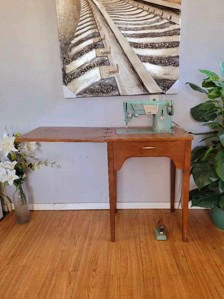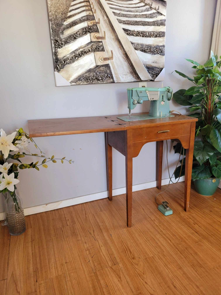 Mid century walnut sewing cabinet with an extendable leaf and a retractable mind green Singer sewing machine in perfect working order.
