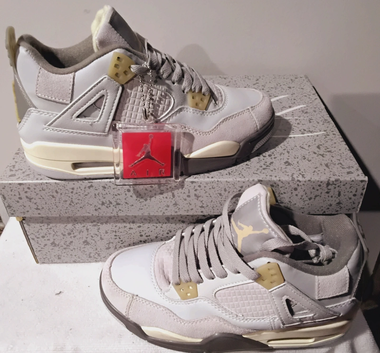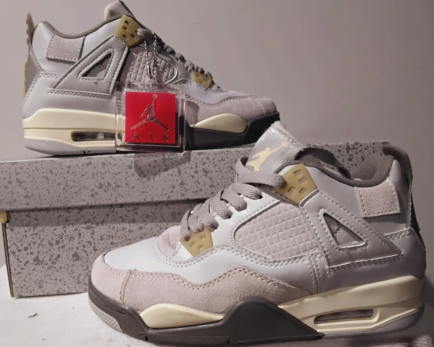 These are Air Jordan 4 Retro sneakers. They feature a light grey and off-white colorway. Includes original box.