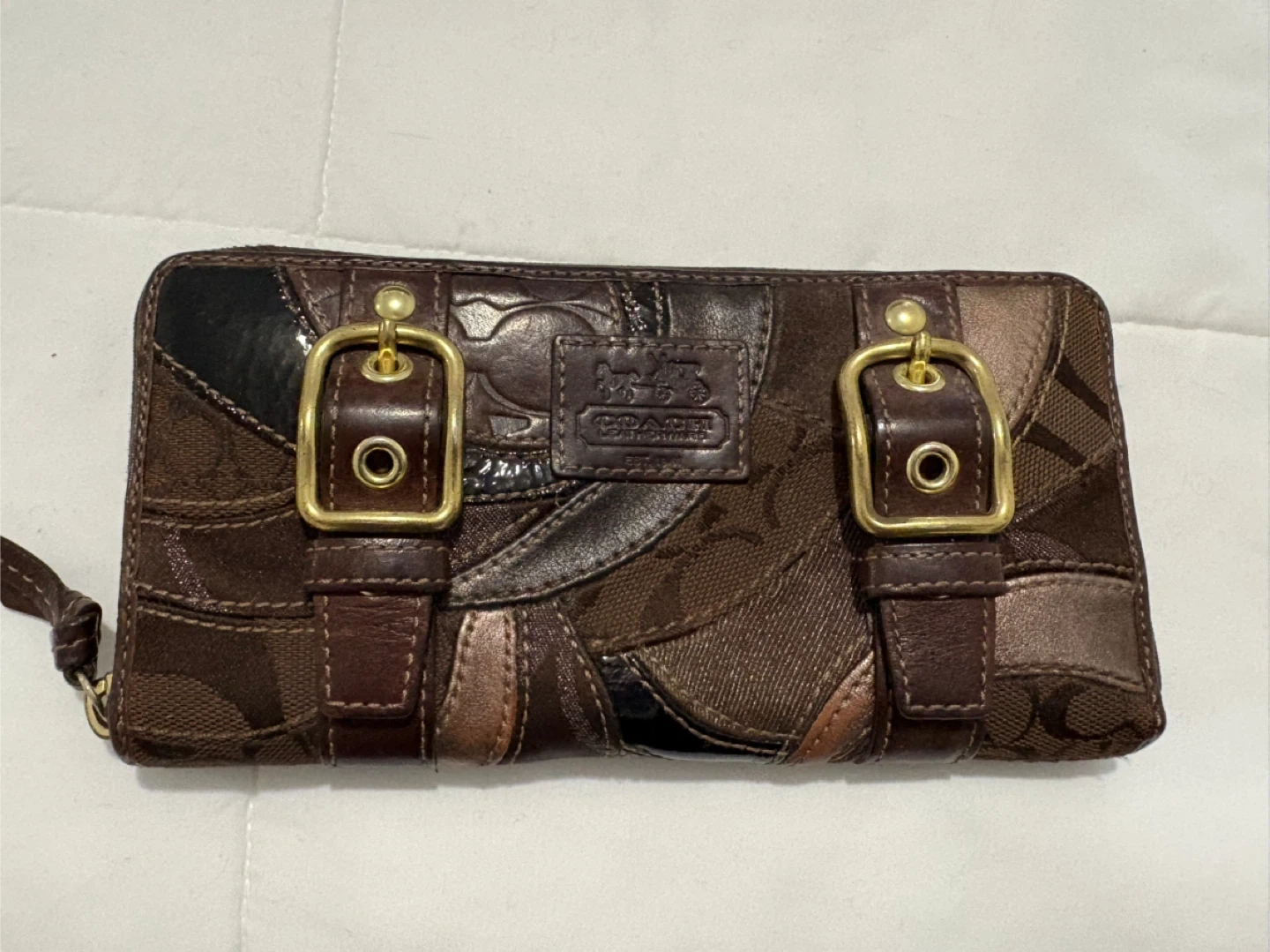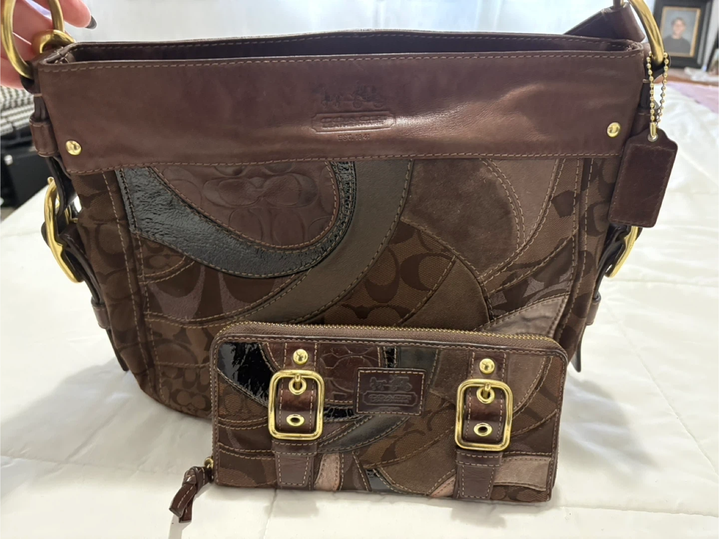 Selling a Coach shoulder bag and matching wallet. The bag and wallet feature a unique patchwork design in various shades of brown. Both are in good condition and ready for a new home! Comes with original Coach tag