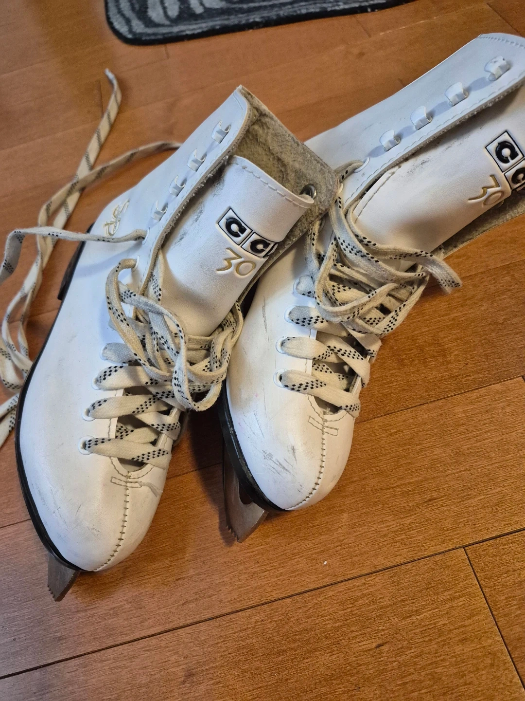 These CCM figure skates are white and size 3. They have laces for a secure fit. Good for beginners or recreational skating.