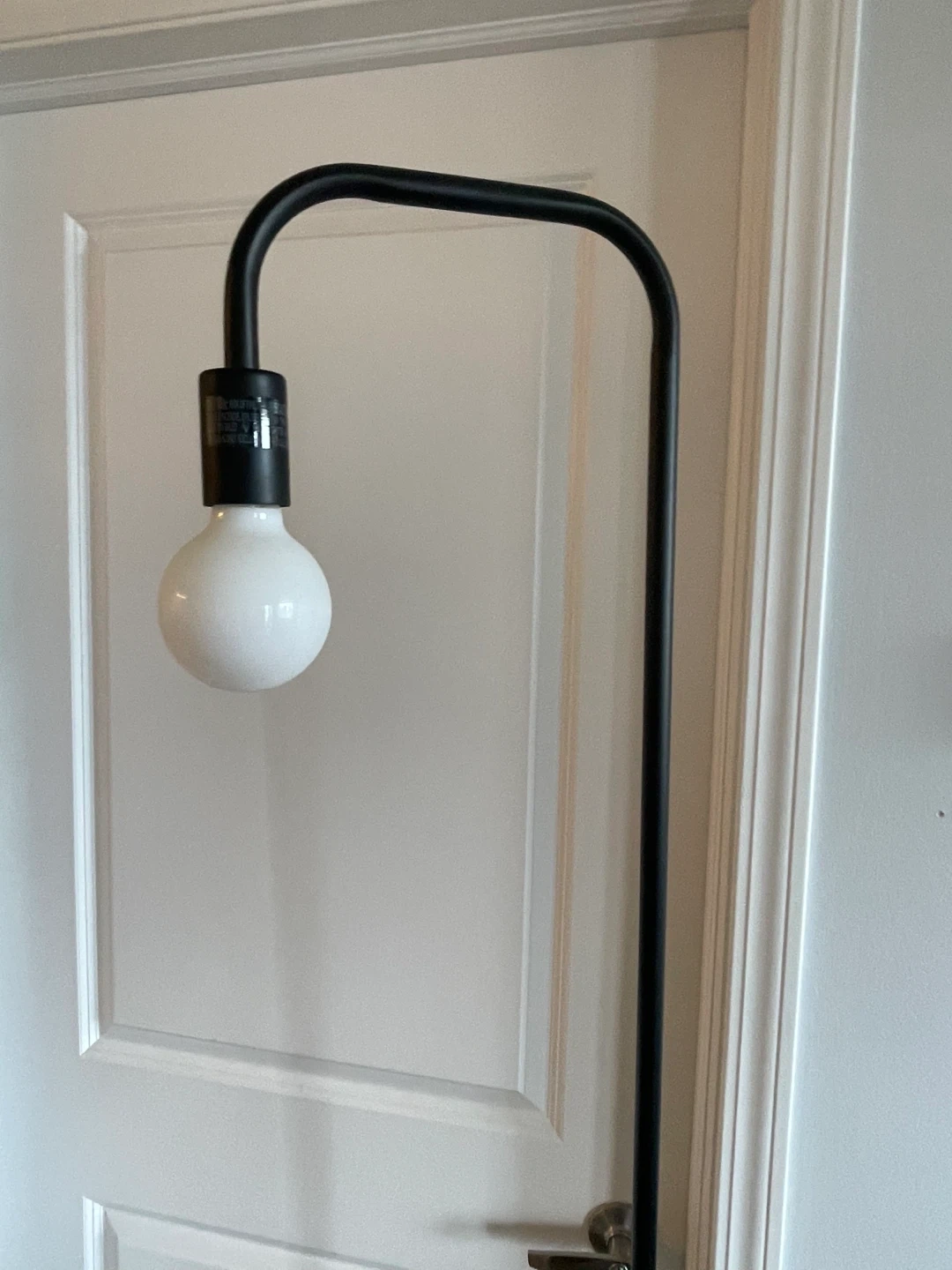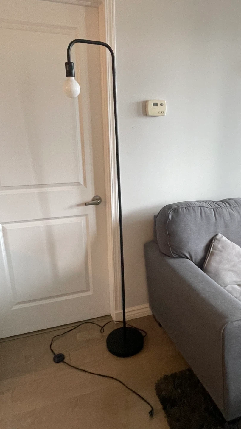 Simple black floor lamp with a curved neck. It has a round base and foot on/off switch on the cord