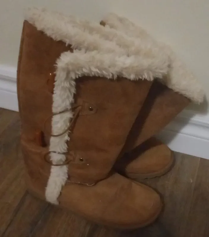 These cozy boots are perfect for cold weather! They feature a faux suede exterior in a warm brown colour, and they're lined with soft faux fur. The boots have a decorative lace-up detail on the side.