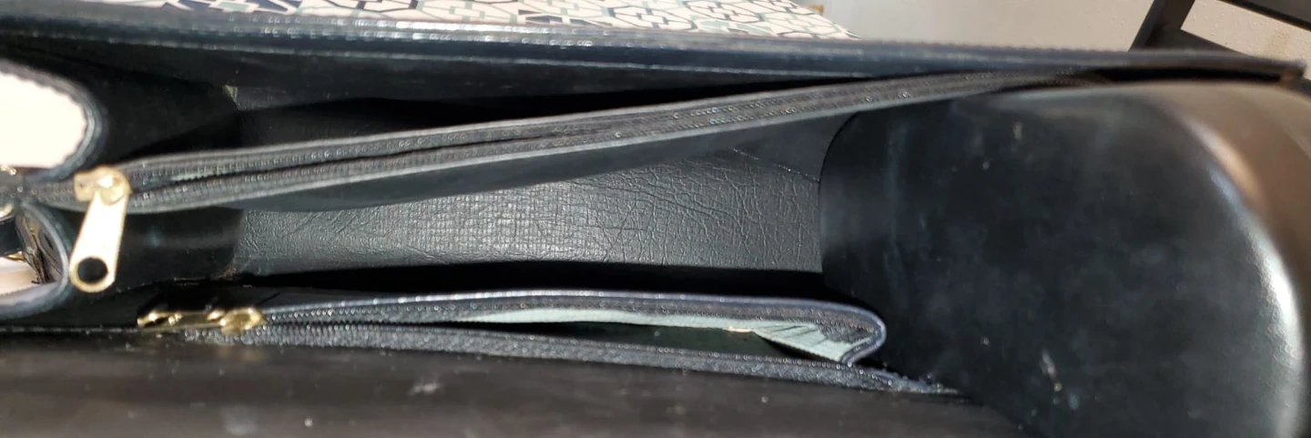 This is a classic navy blue leather handbag by . It features a top handle and a detachable shoulder strap. The interior is lined and has a zippered pocket.