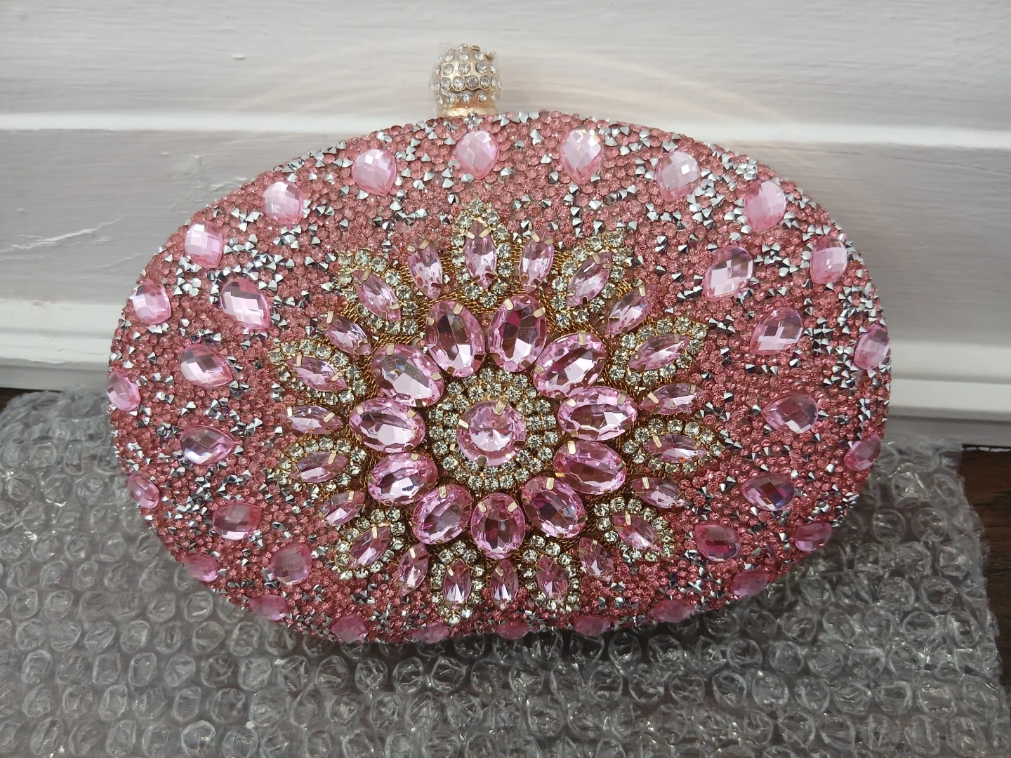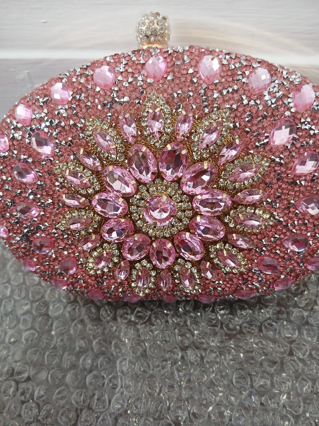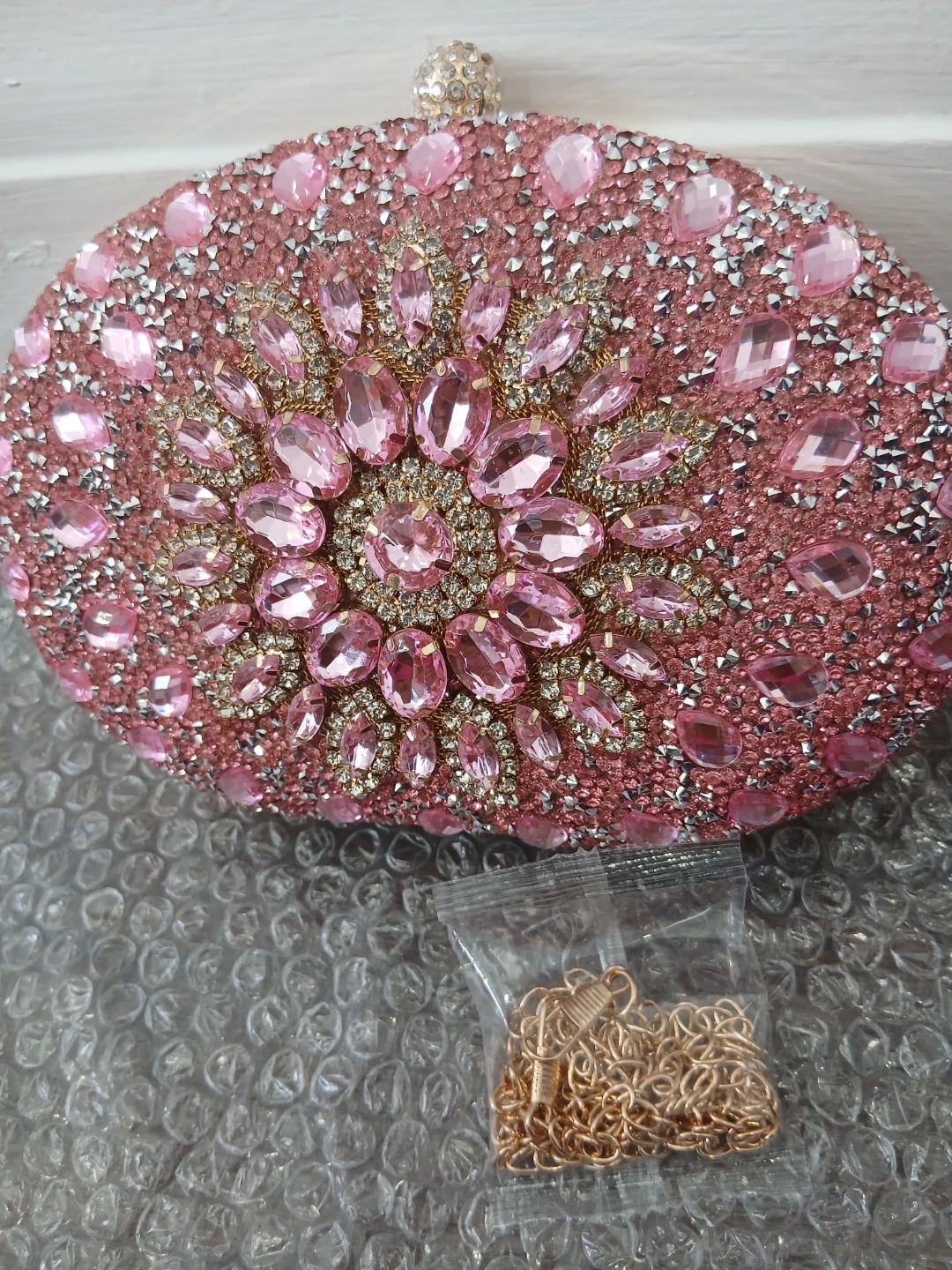 Sparkly pink clutch covered in rhinestones and pink jewels. It has a beautiful floral-inspired design. Includes a detachable gold-tone chain strap. This bag is great for formal events and weddings!