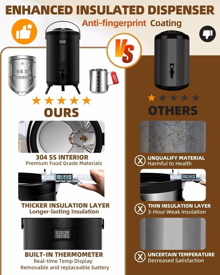 UPGRADED 304 SS INNER: Our insulated beverage dispenser has been upgraded to food-grade 304 stainless steel, which provides better stability, allows it to withstand liquids ranging from -58℉ to 230℉.