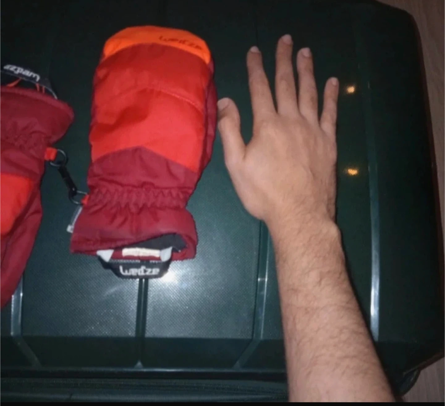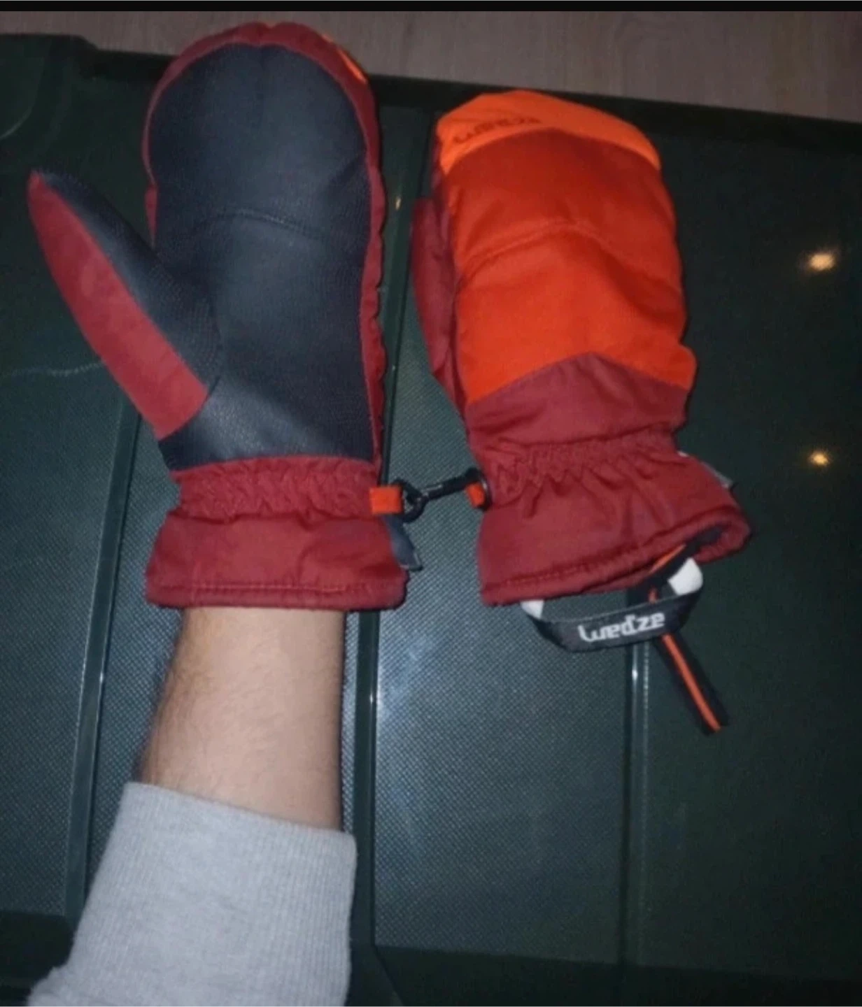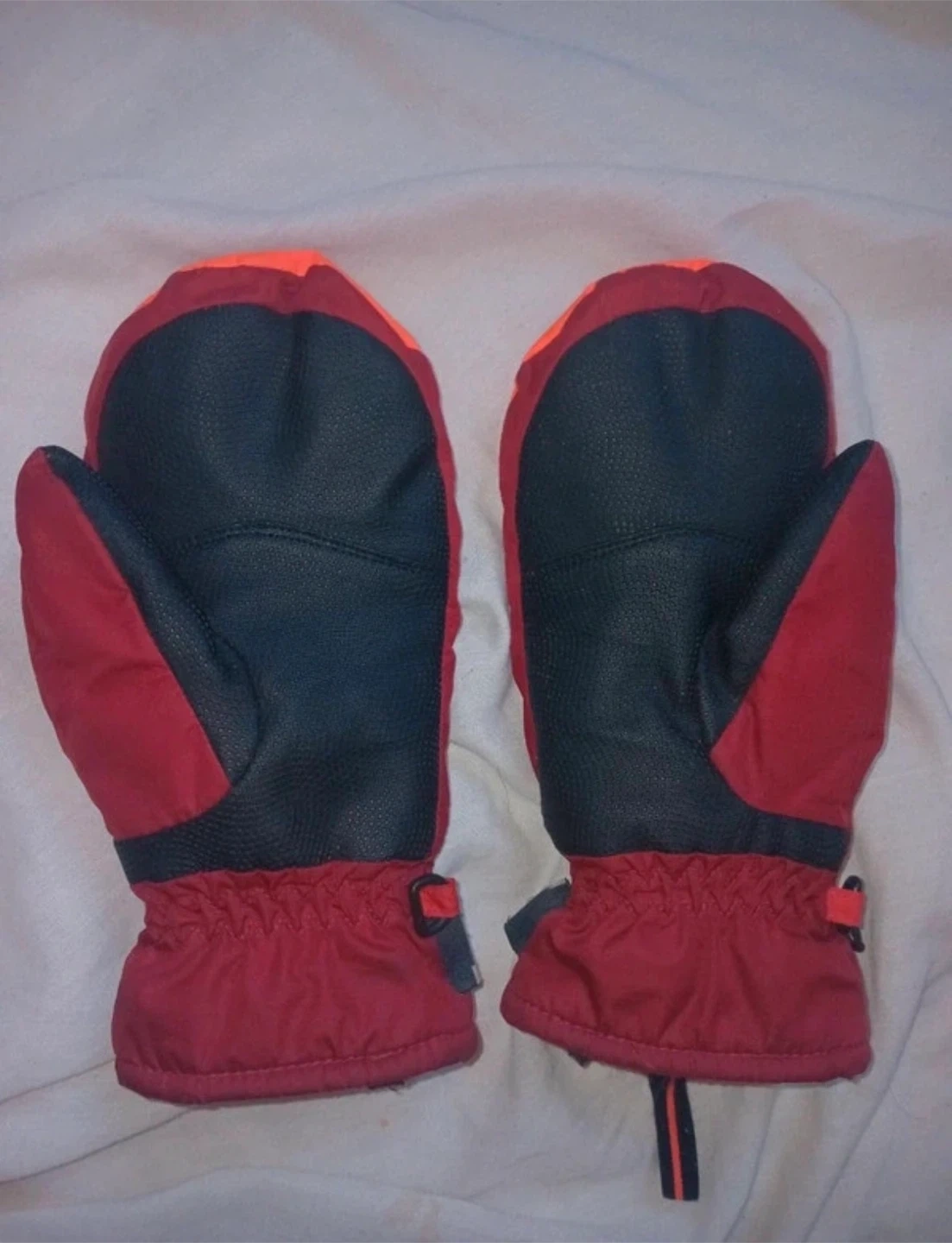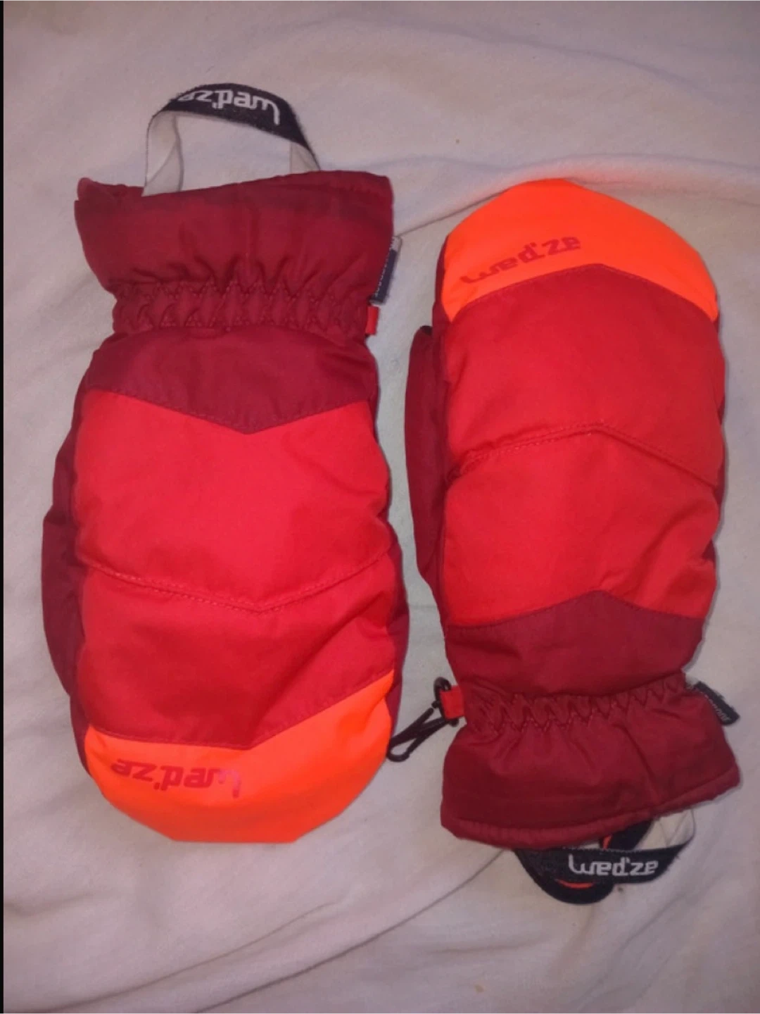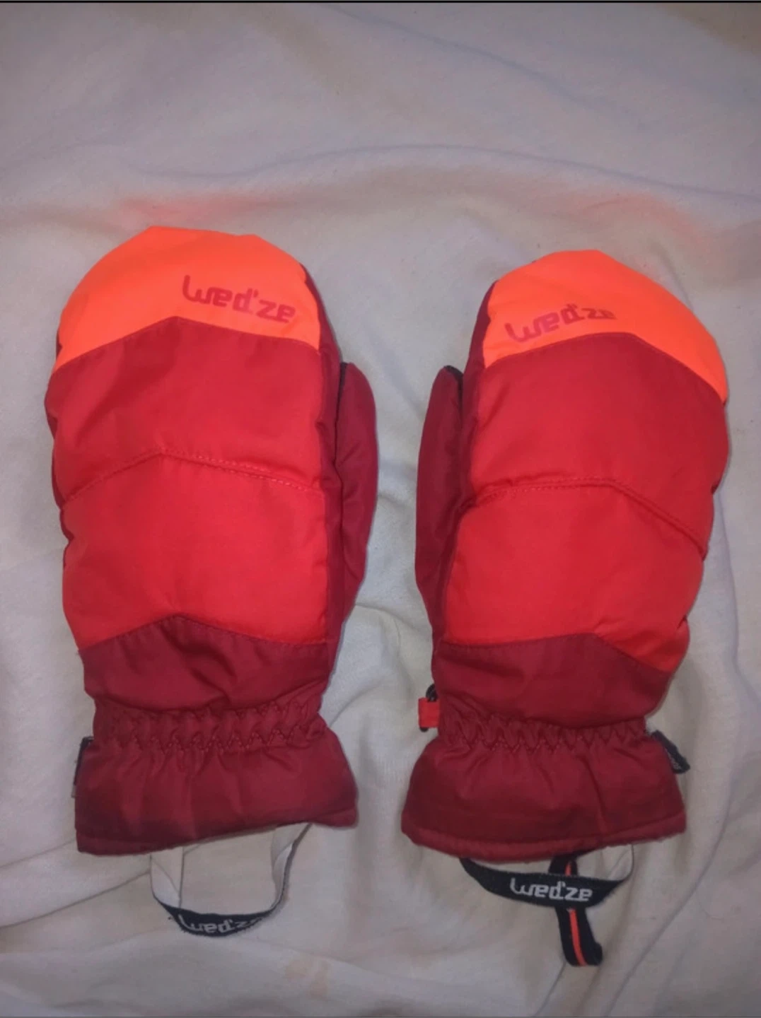 Wedze ski mittens in red and orange. Water-repellent outer shell with fleece lining. Elasticated cuffs with adjustable straps. Included wrist loops to prevent loss.