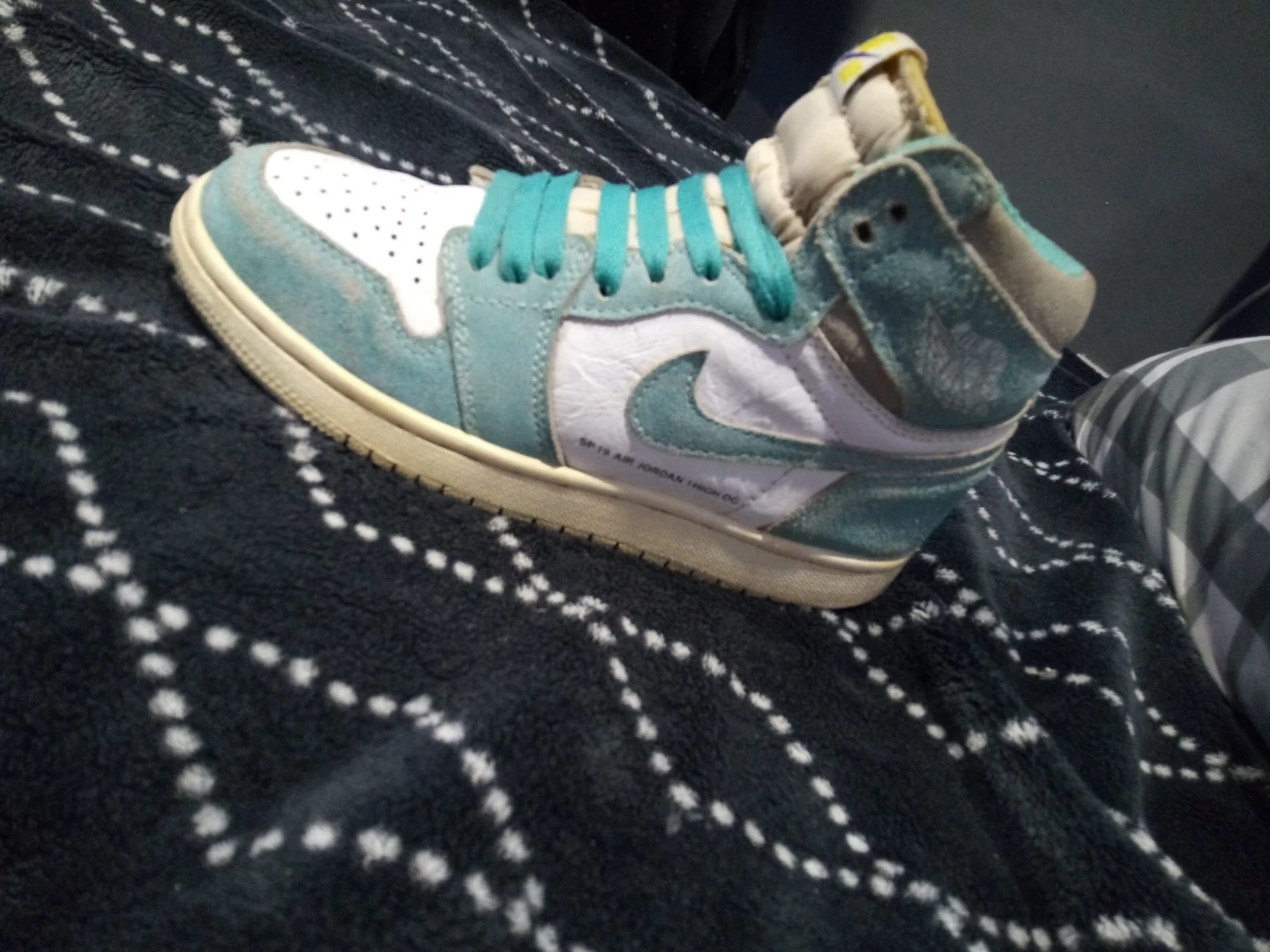 These Air Jordan 1 High OG sneakers feature a stylish "Sky" colorway. The upper is a combination of white and aqua suede, with teal laces. They're a comfortable and iconic choice for any sneaker enthusiast.