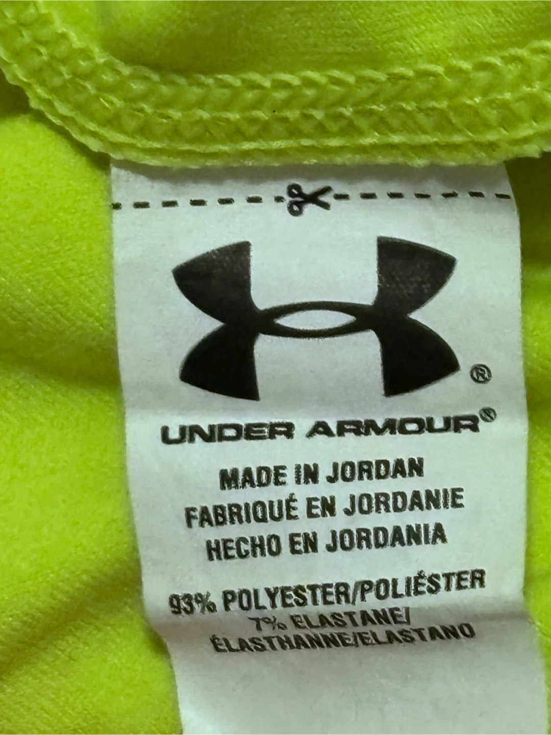 Under Armour long sleeve shirt in a bright neon yellow. It features a fitted design and a 1/4 zip closure. Made with HeatGear fabric for moisture-wicking performance.