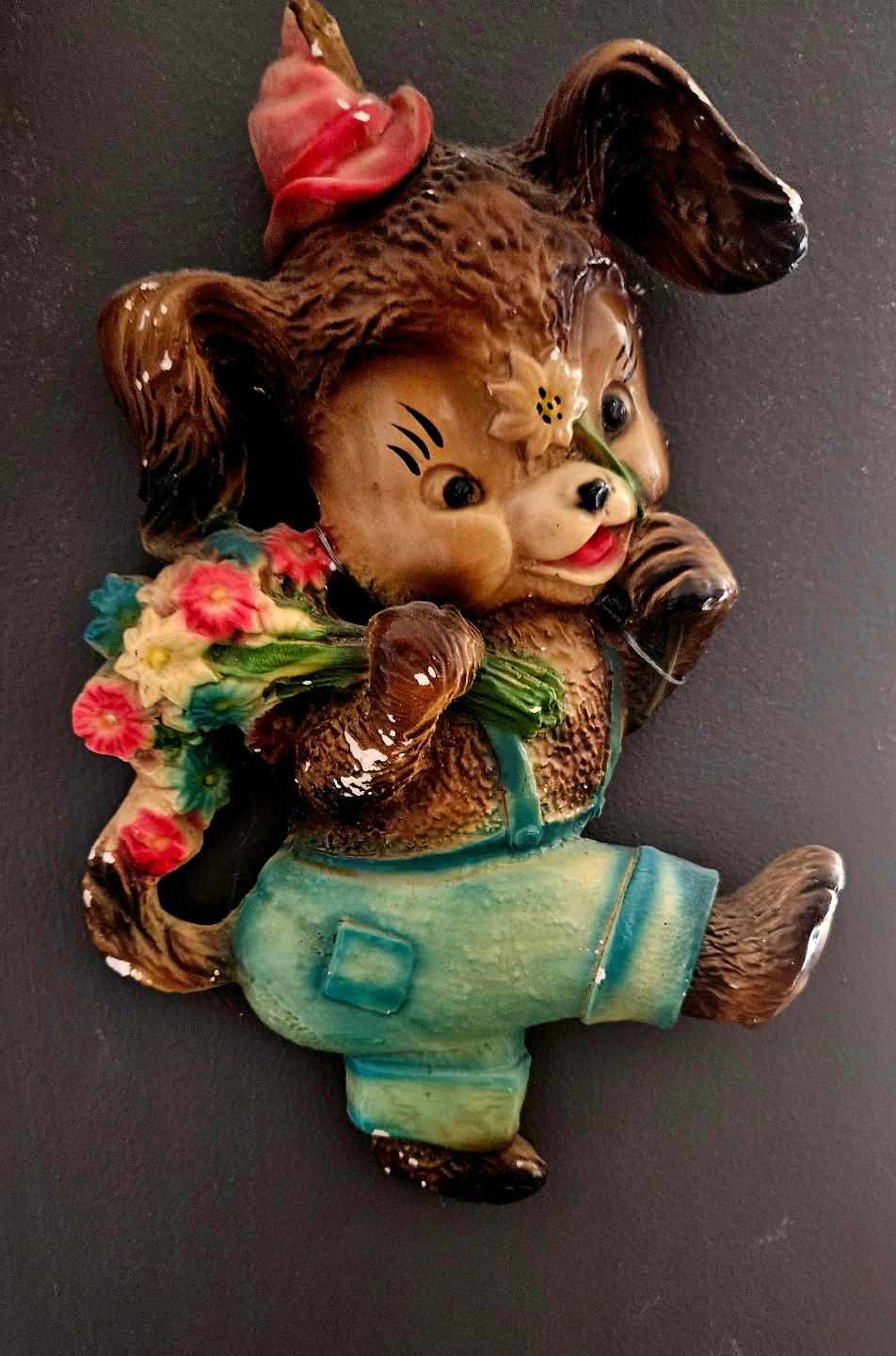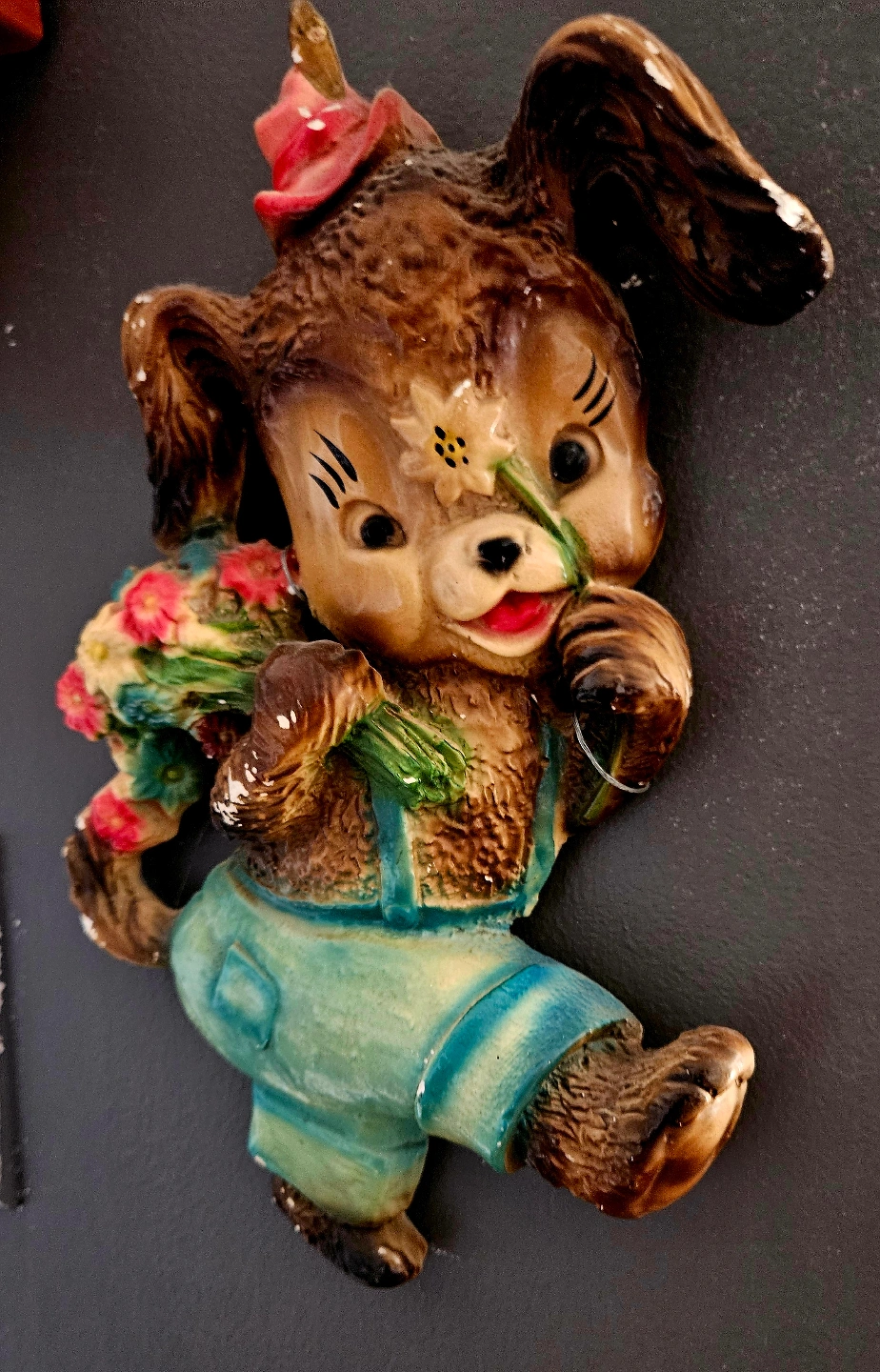 Adorable vintage puppy figurine. Brown puppy wearing overalls and carrying flowers. Perfect for a child's room or collector. Shows some wear consistent with age.