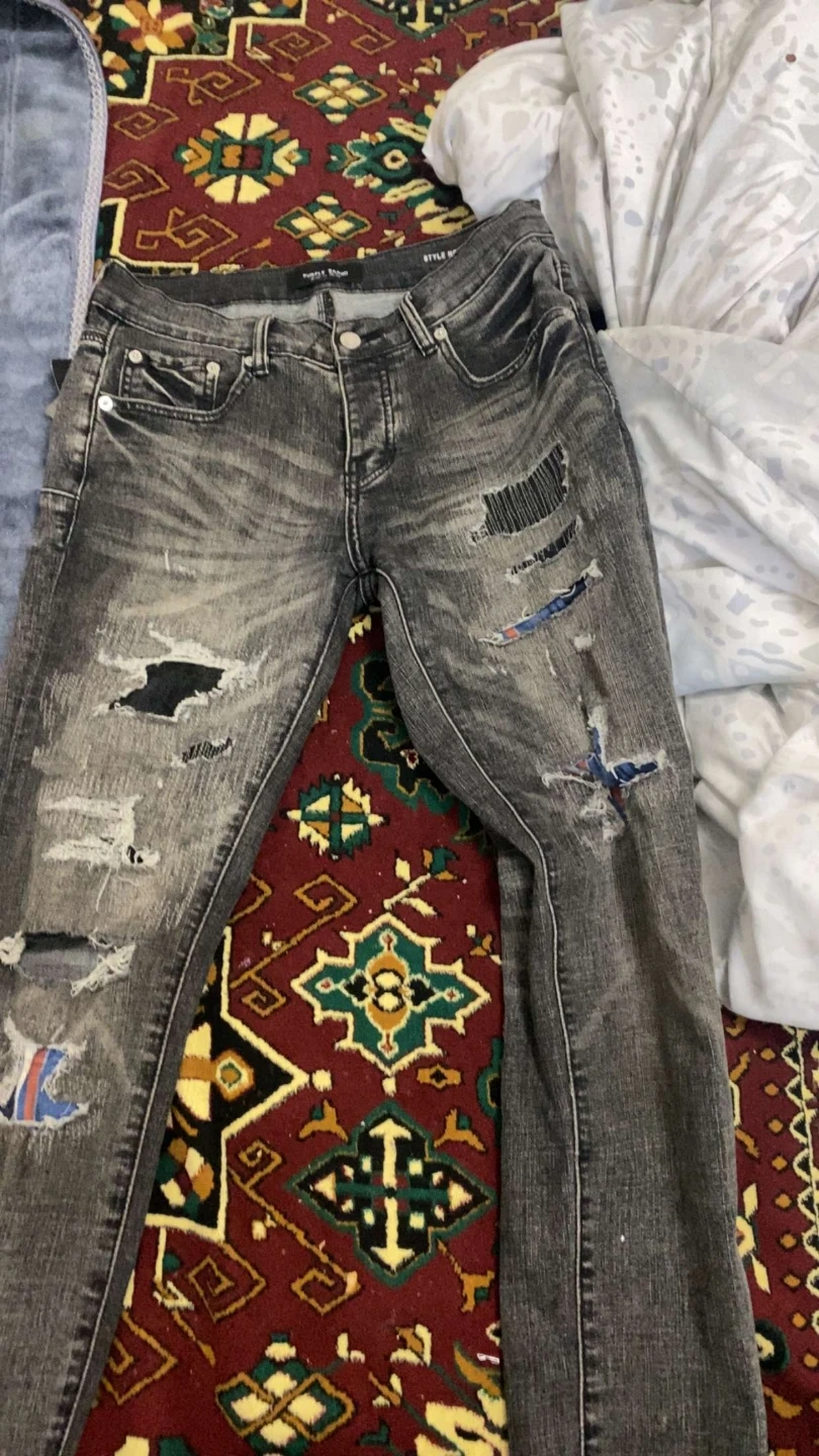 These Purple Brand jeans come in a distressed grey wash. They feature a slim fit with ripped detailing and patches throughout. Made with denim for durability. Perfect for casual wear!