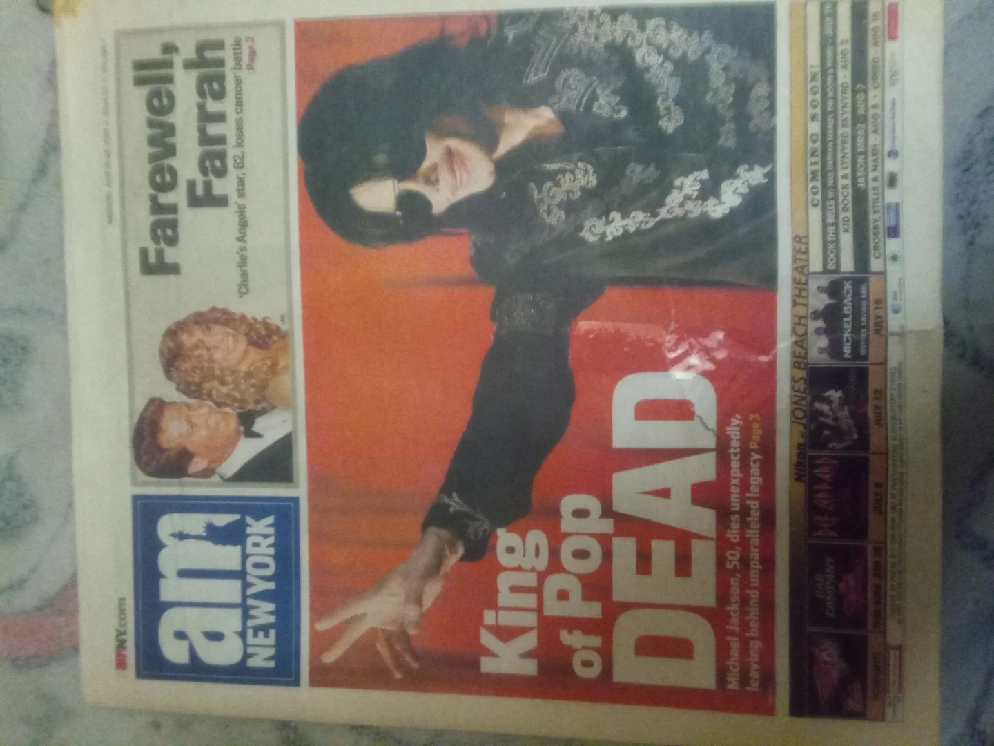 This is a newspaper from 'amNY' featuring the headline 'Michael Jackson's death shocks world'. It also includes a section about Farrah Fawcett's passing. The newspaper is dated June 26-28 2009. It's a piece of news history from that significant day. WHO DOESN'T LOVE KING OF POP. BE THE LUCKY ONE TO OWN A PIECE OF HISTORY.
